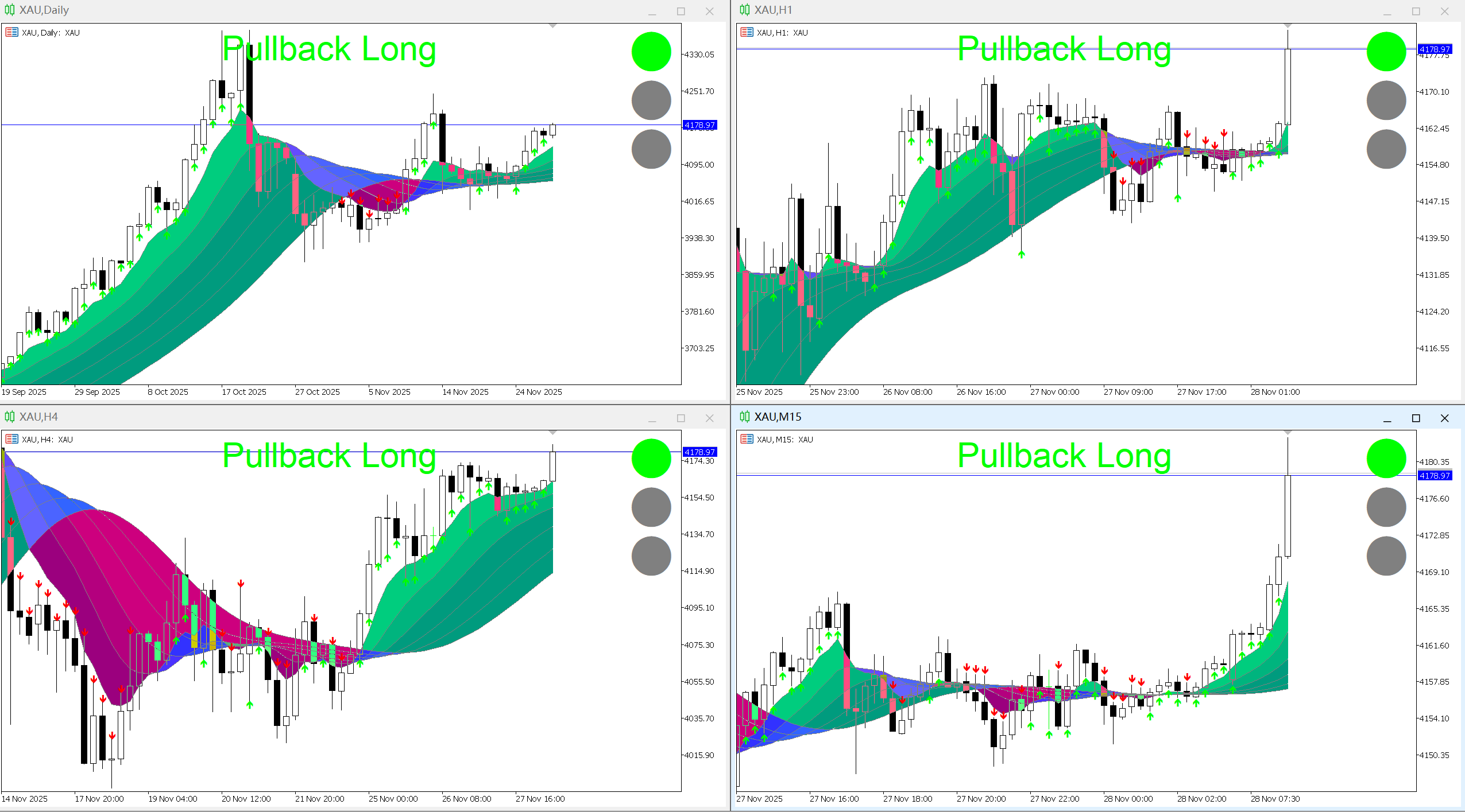 Whether going long or short, you must ensure all timeframe signals align in the same direction before executing an entry: