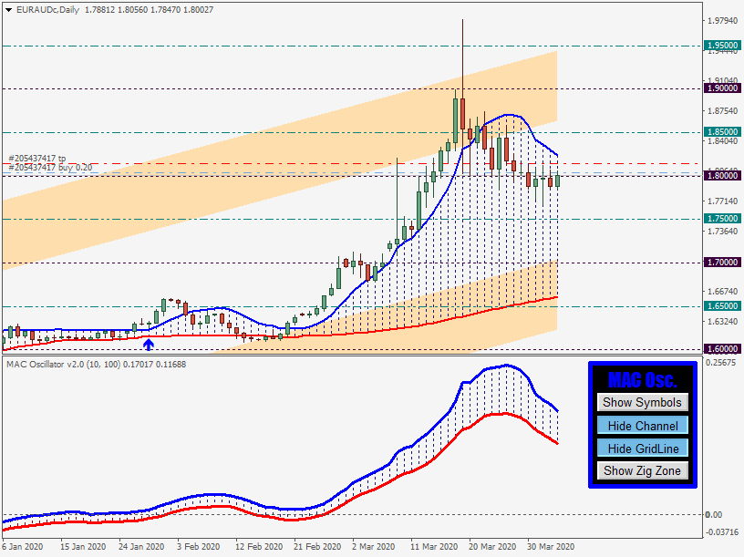 After studying the market in the previous weekend, I followed the trend. I mean by this the strongest currency in its group. I figured it out depending on MAC Oscillator. The EURAUD currency pair was the strongest in an uptrend, while the AUDJPY was the strongest in a downtrend. So, I was bullish on the EURAUD and bearish on the AUDJPY.