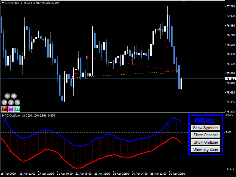 MAC Oscillator is a momentum indicator that measure the difference between Fast and Slow Envelopes used to build the cloud.