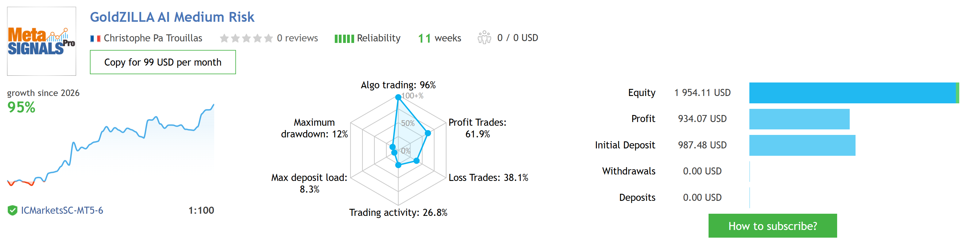 GoldZILLA AI is a multi-strategy algorithm detecting market regimes to dynamically select from five distinct strategies, optimizing returns while minimizing drawdown on XAUUSD.