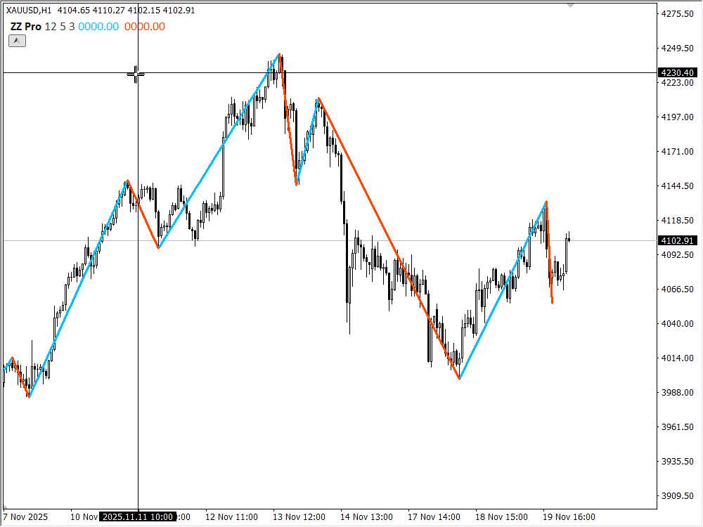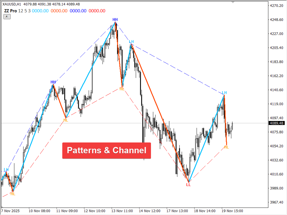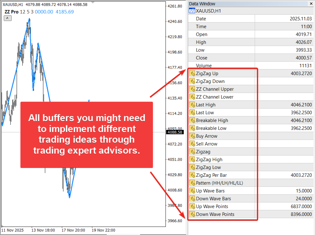 L'indicatore fornisce 20 buffer di dati rispetto a 3 nello ZigZag standard, con algoritmi di calcolo avanzati e riconoscimento dei pattern in tempo reale, prestazioni di rendering migliorate e personalizzazione completa senza necessità di programmazione.