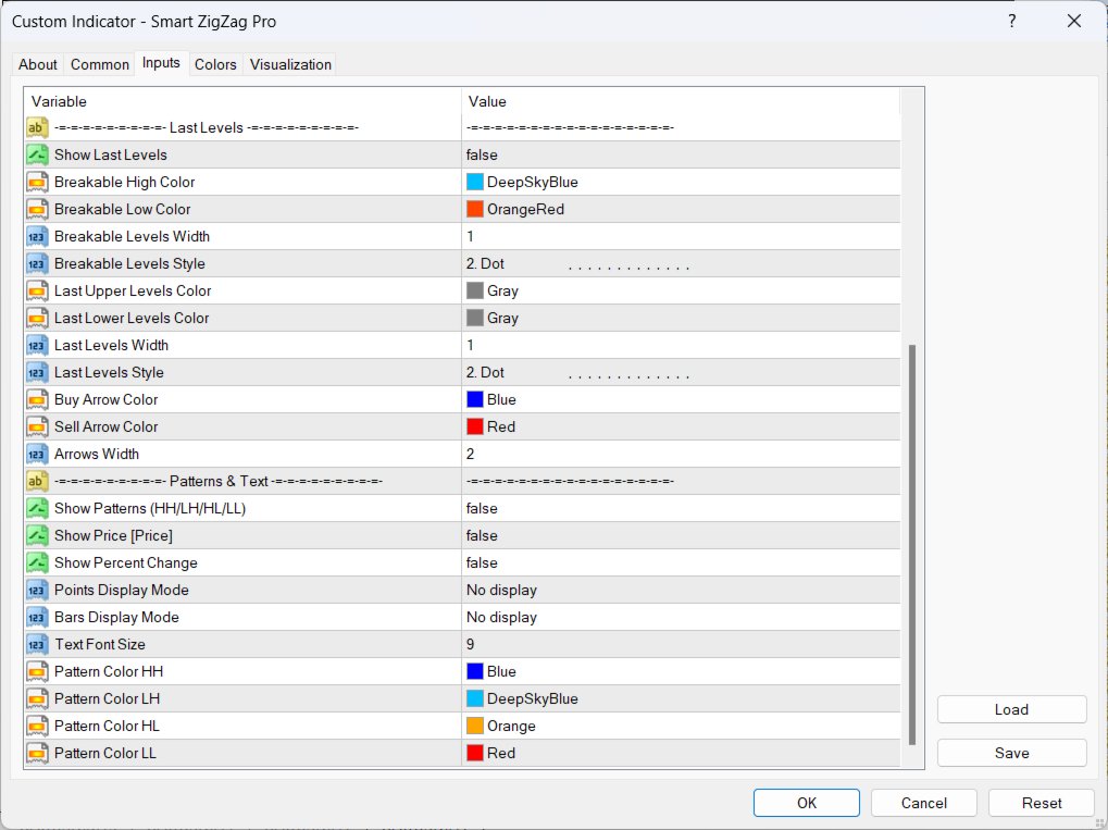 L'indicatore riconosce automaticamente i pattern massimi/minimi consecutivi: Massimo più alto (HH), Massimo più basso (LH), Minimo più alto (HL) e Minimo più basso (LL). Ogni pattern è contrassegnato con un colore diverso, rendendo il riconoscimento rapido e chiaro. I colori dei pattern, la dimensione del carattere e la visualizzazione possono essere personalizzati o nascosti secondo le preferenze.