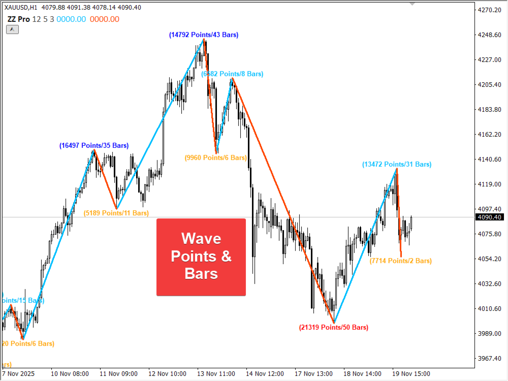 L'indicatore misura la lunghezza delle onde in diversi modi: visualizzazione dei punti (distanza di prezzo), visualizzazione delle barre (distanza temporale), con multiple opzioni di visualizzazione che includono solo numeri, con etichette corte o testo completo. Le statistiche delle onde sono anche disponibili nella finestra dati tramite buffer dedicati, fornendo capacità di analisi avanzate.