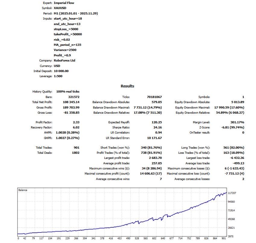 Imperial Flow is a high-precision expert advisor designed specifically for trading XAUUSD on the M1 timeframe. The algorithm automatically determines optimal StopLoss and TakeProfit levels based on market volatility, trend strength, and local price structure.
