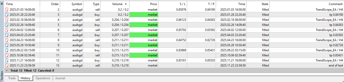Questo Expert Advisor analizza il mercato su diversi timeframe opzionali (M15, M20, M30, H1, H2, H3, H4) e seleziona automaticamente solo le opportunità di trading valide quando il mercato rispetta rigorosi criteri di trend e struttura del prezzo. TrendScope non forza l'apertura di posizioni—attende configurazioni pulite e di alta qualità basate su una solida logica di price action.