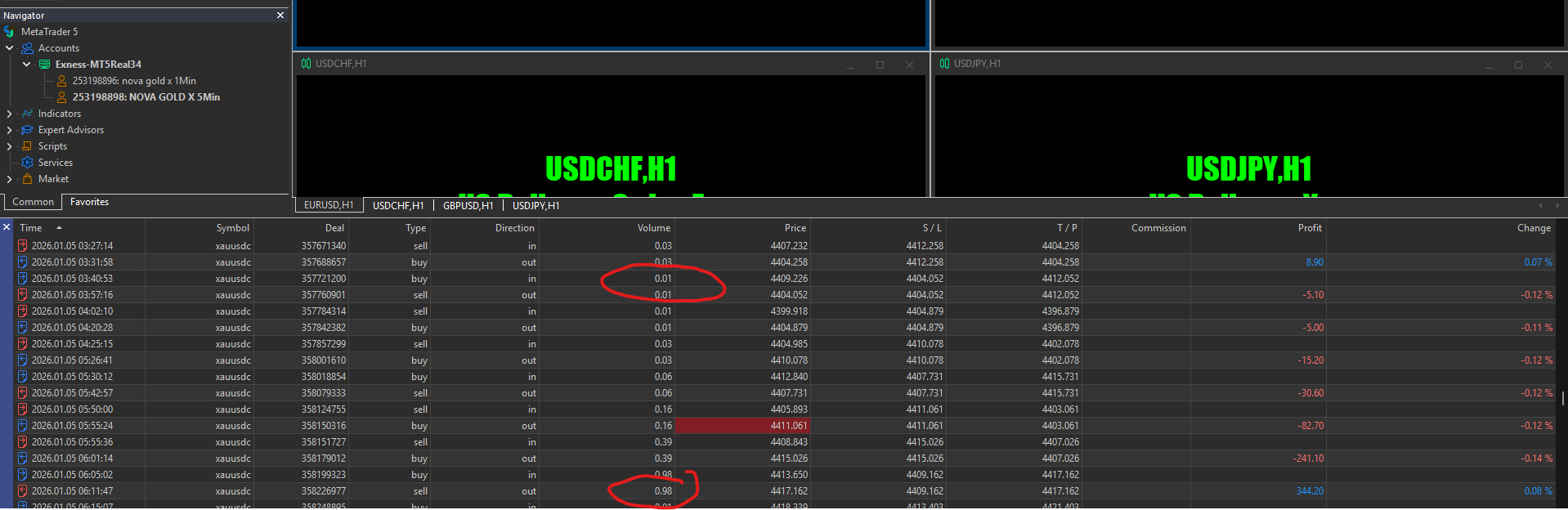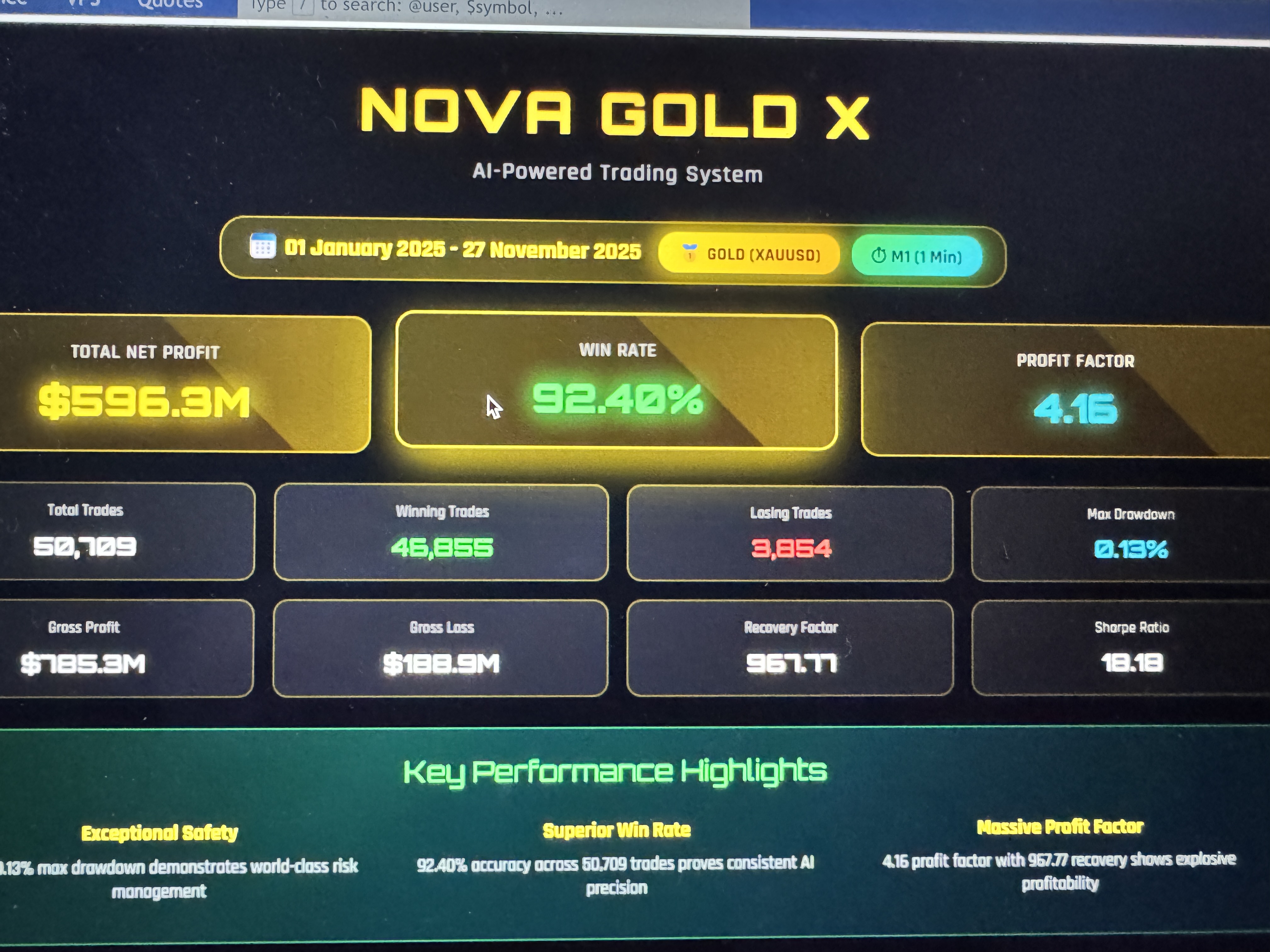 Hi again, trading friends. First, I used a real account for the trials. Here come the results from my first trading week with Nova Gold X, a bot that all the reviewing members have given five stars, including me. The bot supports two trading pairs: gold and bitcoin. I have only been using the bot since the 31st of December. The very first day gave 112.01 euros, gold 101.95, and bitcoin 10.06. At that moment, I jumped up, gave the bot five stars, and left a good comment (see 1st of January 2026). An excellent EA, I thought, giving so much return. The second day gave me 47.14 euros, gold 40.05, and bitcoin 7.09. The third day was a Saturday, and the bitcoin gave me -7.51 euros. The 5th of Jan., on the trial's fifth day, the outcome was -4.70 euros, gold 7.36, and bitcoin -12.06. On the sixth of January, I decided to stop using Bitcoin and only concentrate on gold. The reason was an excessive drawdown on the account—much more than I expected. Thanks to the repair mode built into the bot. I had repair mode set to 2.5 (the manufacturer's set file). When you use the repair mode, it higher the next trade by 2.5 times. Initially, I started with 0.01 pips. It failed. With the repair mode, the next trade was 0.03 pips. It failed. Next trade was 0.06 pips. It failed. The following trade was 0.16 pips. Even that trade failed. Then came another repair mode of 0.39 pips. A failure. After that came 0.98 pips. Now the sweat broke out on my forehead. If that one failed, I would lose 417.90 euros. My luck turned for the better, and I ended up with 250.74 euros. Uff... The repair mode is a death trap! I considered myself a lucky man and stopped using the bot. Results: Without the repair mode, the bot is a loser; with it, the bot is a dethtrap. Reg EPH1