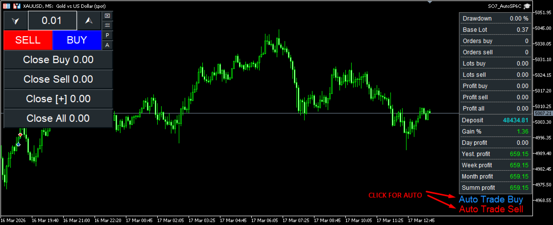 The Expert Advisor has built-in functionality for manual trading. This panel allows you to resize buttons and show/hide position close buttons. The panel can be moved to a convenient location on the chart, and its position is remembered. There are also panels for the current status and statistics. In the lower right corner, there is an active trading status bar, which can be clicked to enable/disable automated trading.