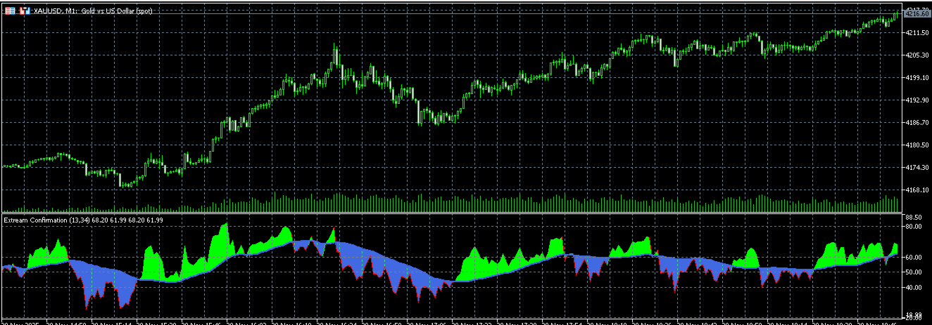 Extreme Confirmation is a sophisticated oscillator designed to filter market noise and provide clear, visual confirmation of trend direction and potential reversal points. By combining dual-period momentum analysis with a dynamic signal cloud, this indicator helps traders identify high-probability entry and exit zones.