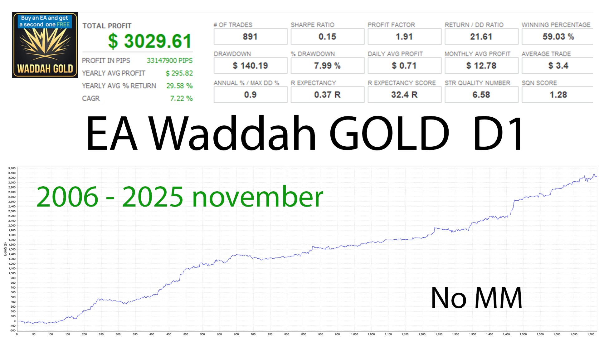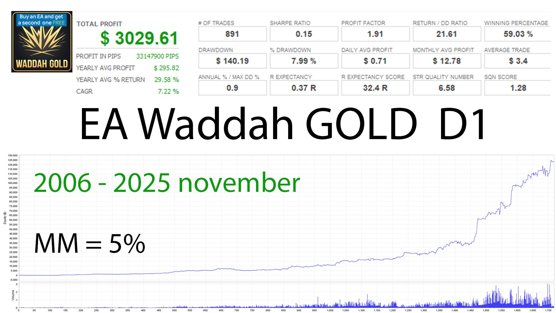 EA Waddah GOLD D1 is a powerful, fully automated trading Expert Advisor designed to trade gold (XAUUSD) on the daily timeframe (D1). It combines four independent, time-tested strategies, providing stable capital growth with low risk.