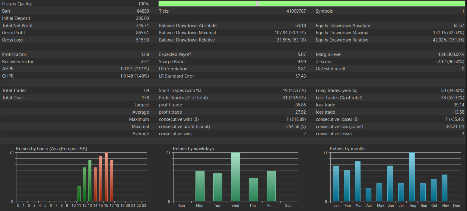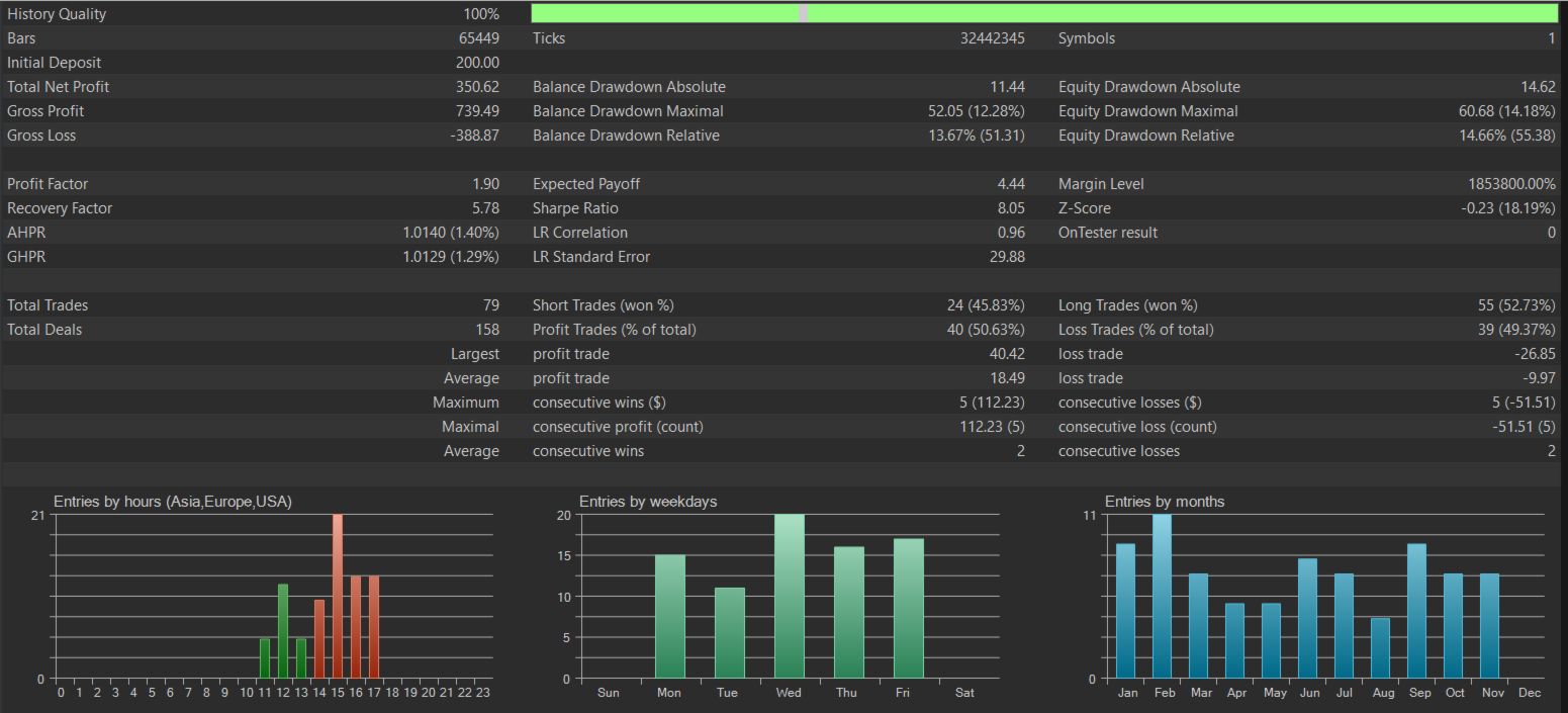 – 2024: approx. 350 net profit, Profit Factor ≈ 1.90, max relative drawdown ≈ 14%.