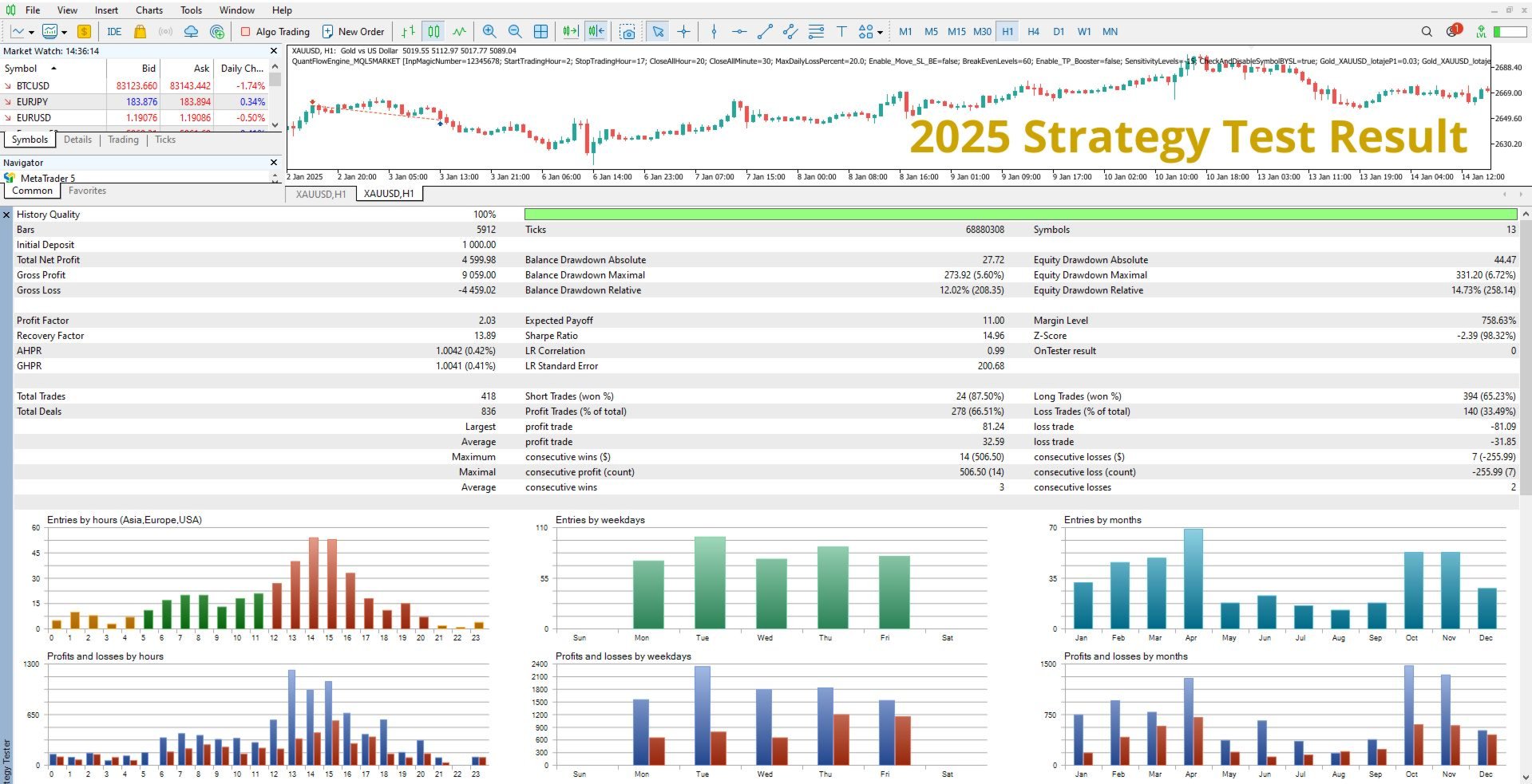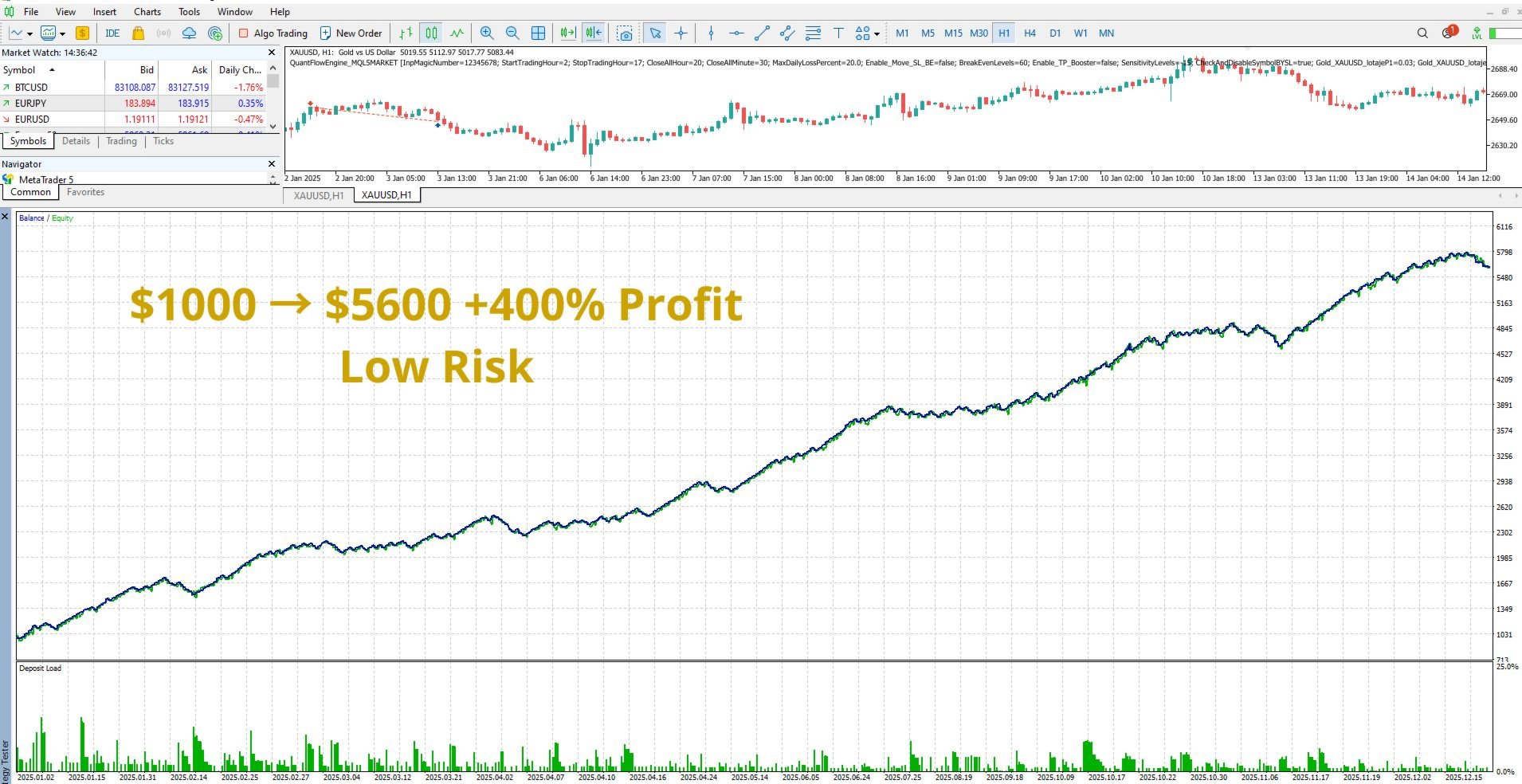 QuantFlow Engine Adaptive Intelligence System is a multi-asset Expert Advisor for MetaTrader 5 designed to trade Forex, metals, stock indices, and cryptocurrencies from a single chart.