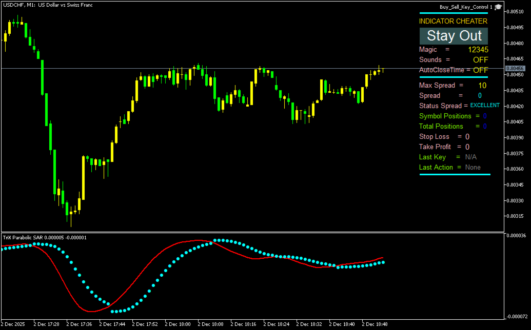 ParabolicSariTriX è un indicatore ibrido che combina l'oscillatore di tendenza TriX (tripla media mobile esponenziale) con il sistema parabolico di stop e inversione (Parabolic SAR). L'indicatore viene visualizzato in una finestra separata ed è progettato per identificare punti di ingresso e uscita sulla base di segnali di inversione di tendenza. Fornisce segnali visivi chiari sotto forma di punti SAR, che cambiano posizione rispetto alla linea TriX al variare della tendenza del mercato.