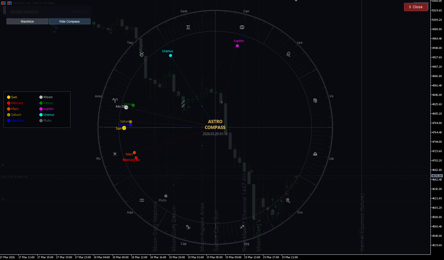Unlike standard indicators that rely on past price data, AstroMaster utilizes high-precision astronomical algorithms (Keplerian Elements and Brown’s Lunar Theory) to determine the exact position of celestial bodies. It identifies critical cosmic events—such as planetary retrogrades, zodiac changes, and lunar phases—that are often correlated with market turning points, volatility, and trend reversals.