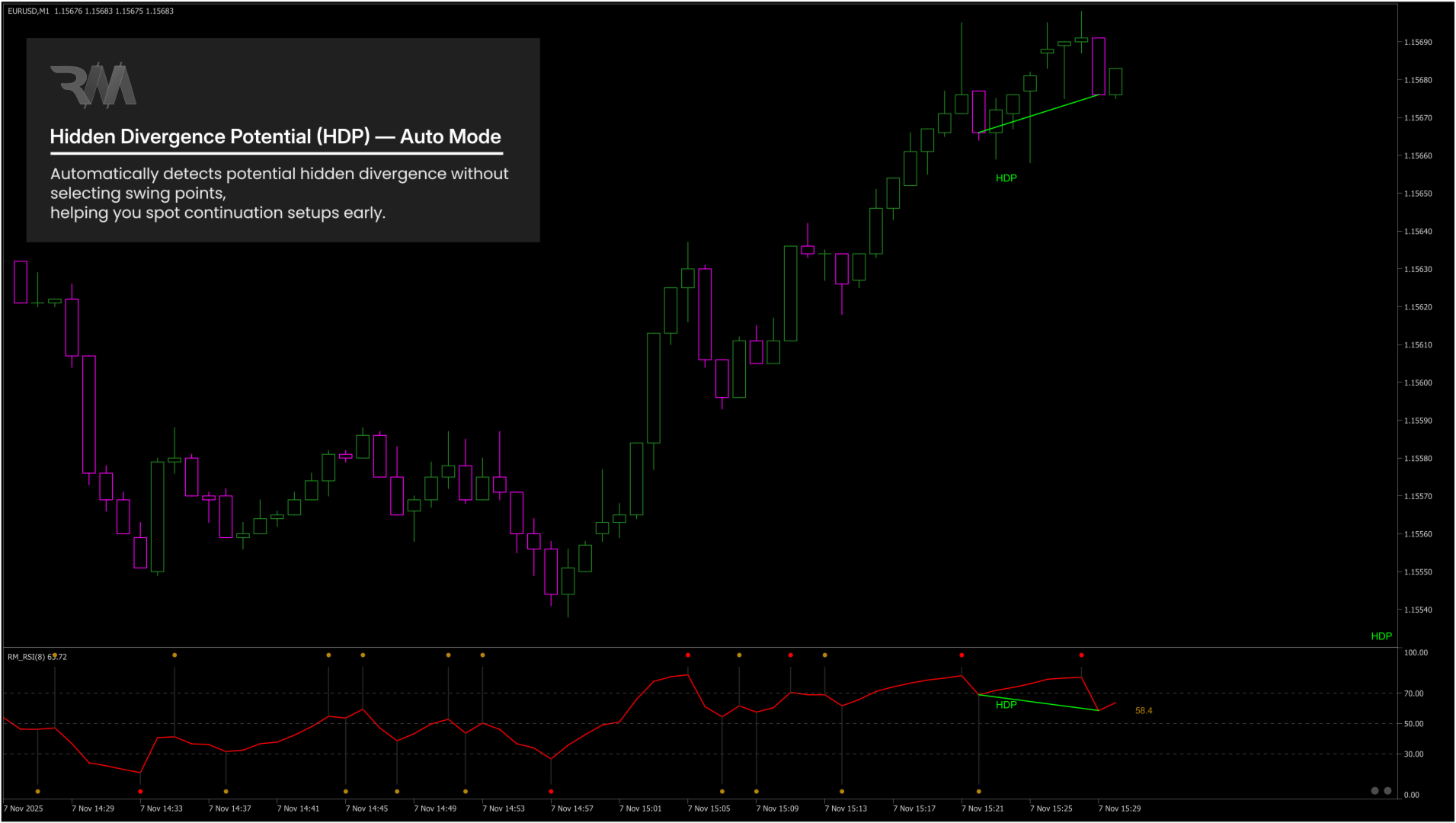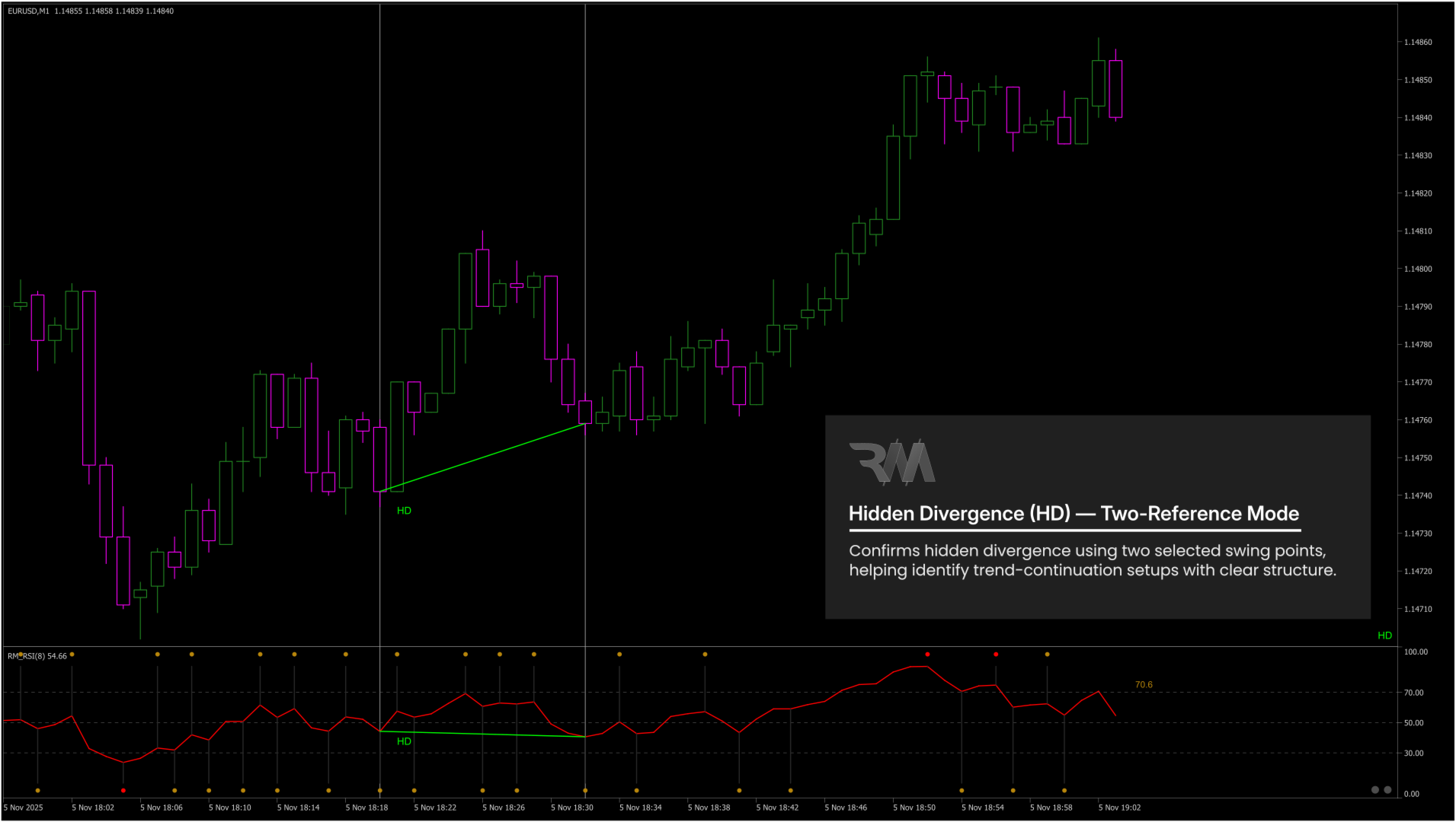 • Use Hidden Divergence (HD) during pullbacks in strong trends.
