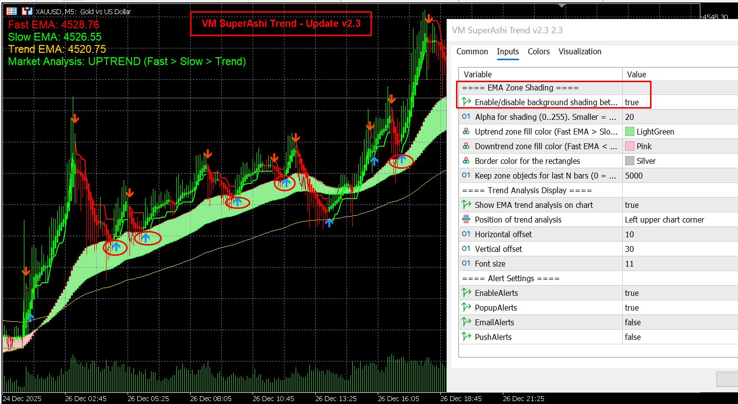 - Added EMA zone shading between the Fast EMA and Slow EMA to identify important buy/sell areas within the trend-based colored zone.
