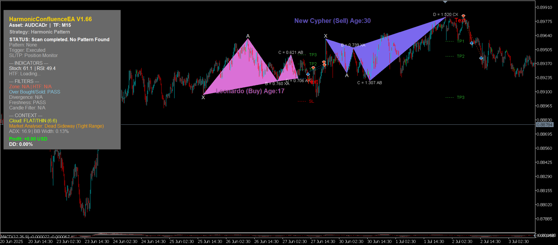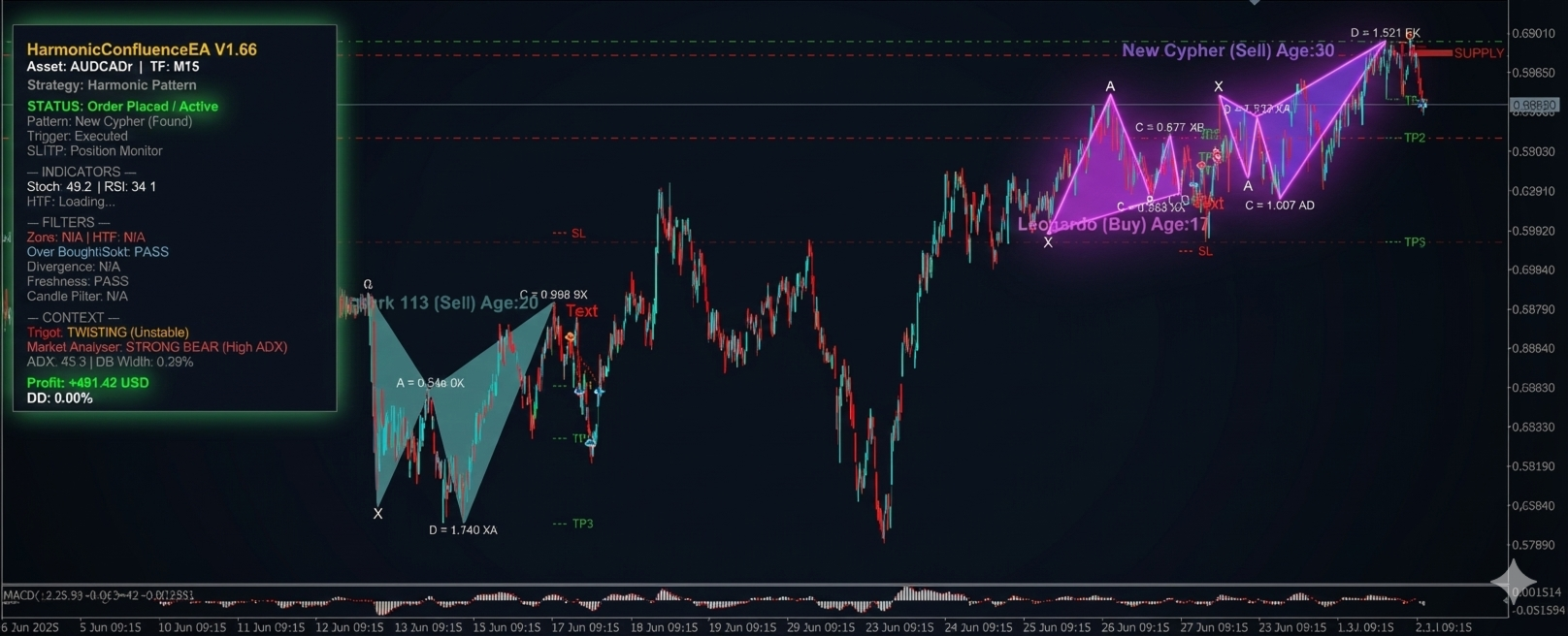 Harmonic Confluence EA is a state-of-the-art algorithmic trading solution designed for the MetaTrader 5 (MT5) platform. It combines the geometric precision of Harmonic Pattern recognition with advanced Market Context Filters and a robust Risk Management Engine.
