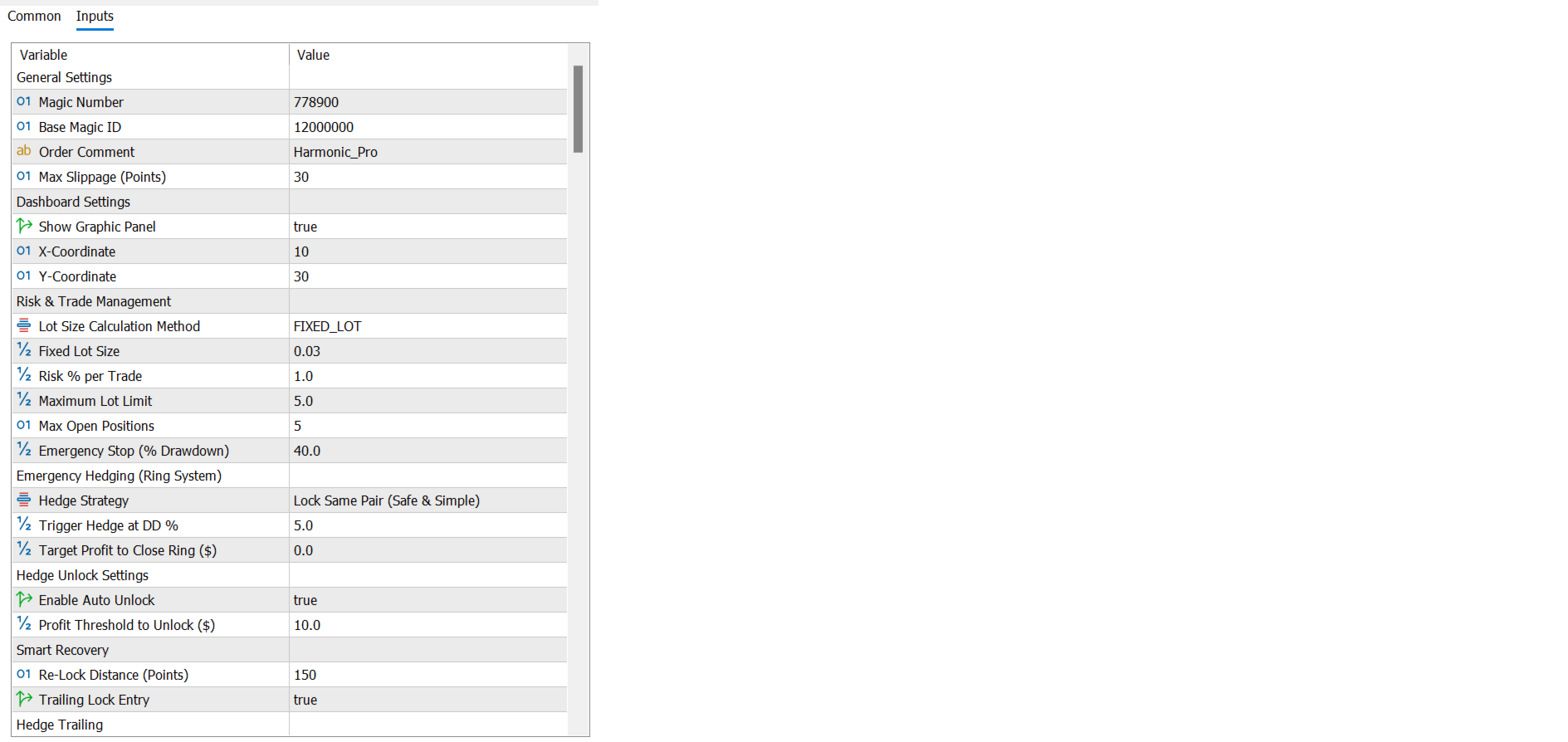 Inp_Hedge_Mode : Select HEDGE_MODE_DIRECT_LOCK for safety or DISABLED for standard trading.