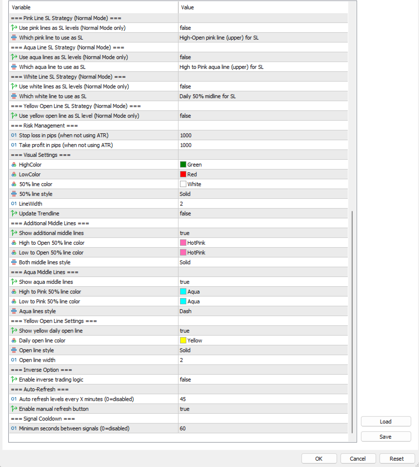 In mean-reversion mode, the EA is run with inverse logic enabled. Instead of buying strength or selling weakness, the system sells breaks above the daily high and buys breaks below the daily low, fading extended price moves back toward balance. In this configuration, take profits are typically set to the white daily midline or the yellow daily open, which represent natural equilibrium levels for intraday price rotation.