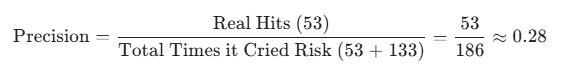 Precision 0.28 (28%): Ele apita quando você queima uma torrada. É chato? Sim. Você deixa de comer a torrada (perde um trade bom)? Sim. Mas ele garante que se houver um incêndio real, ele vai apitar.