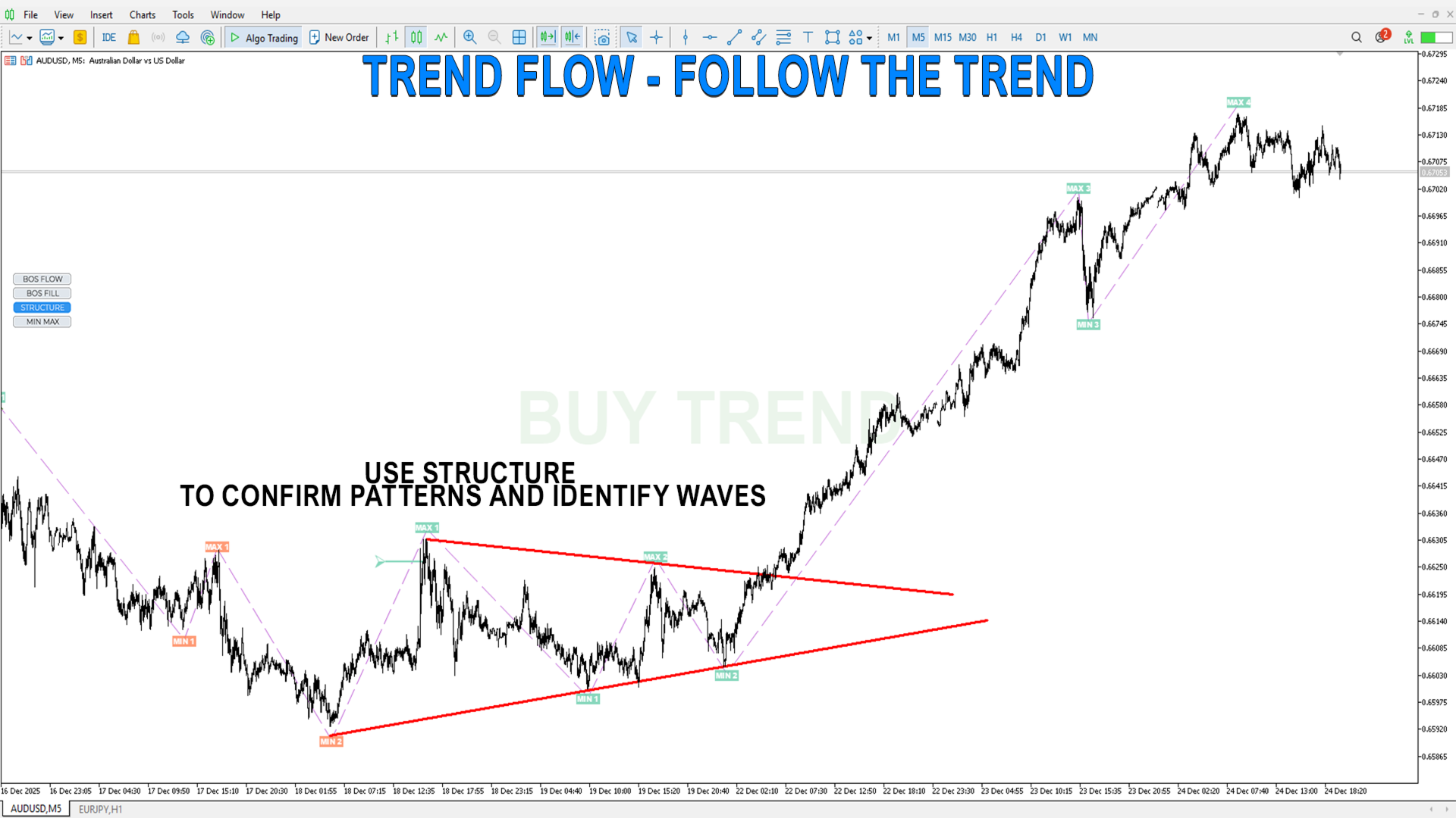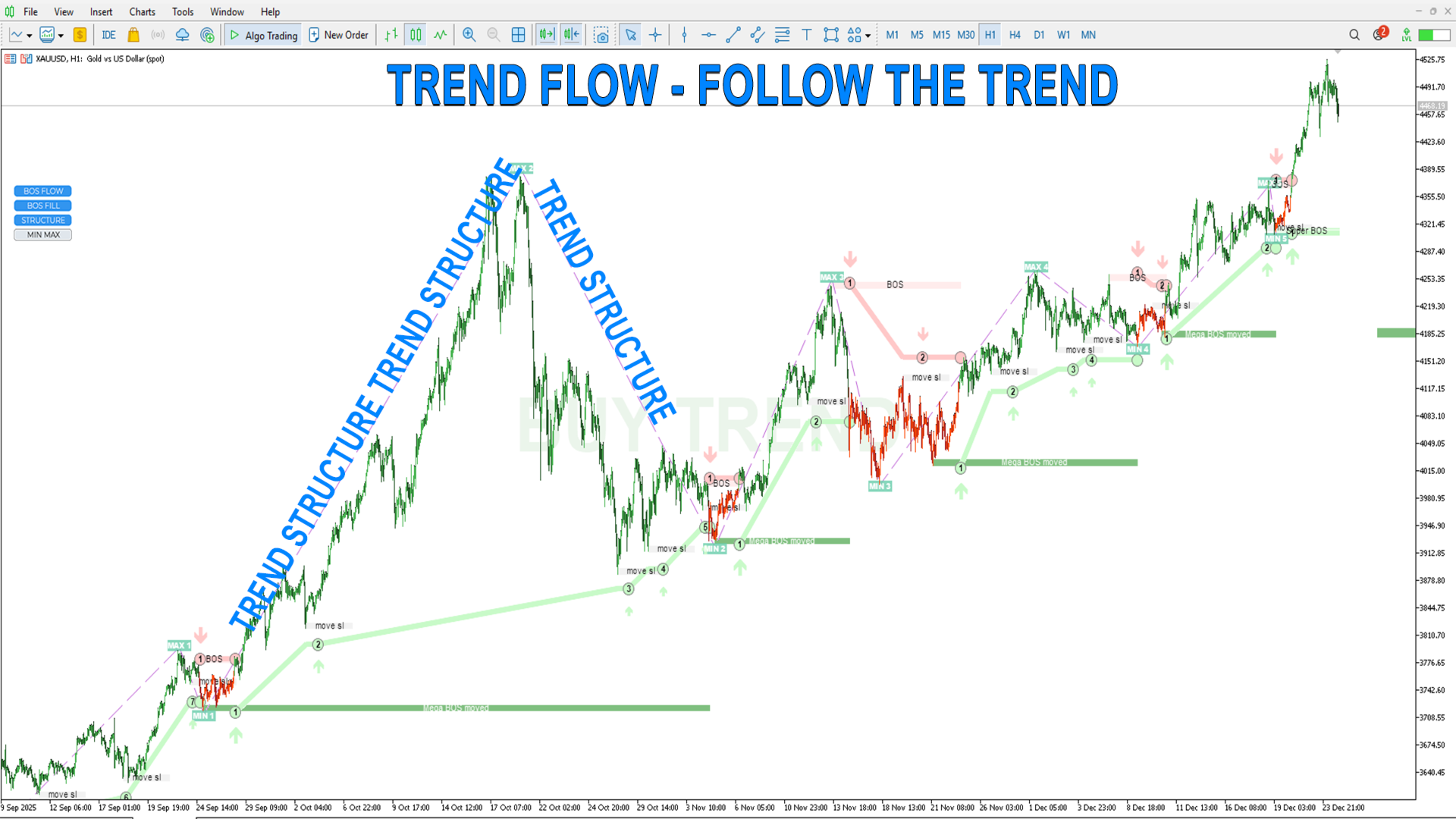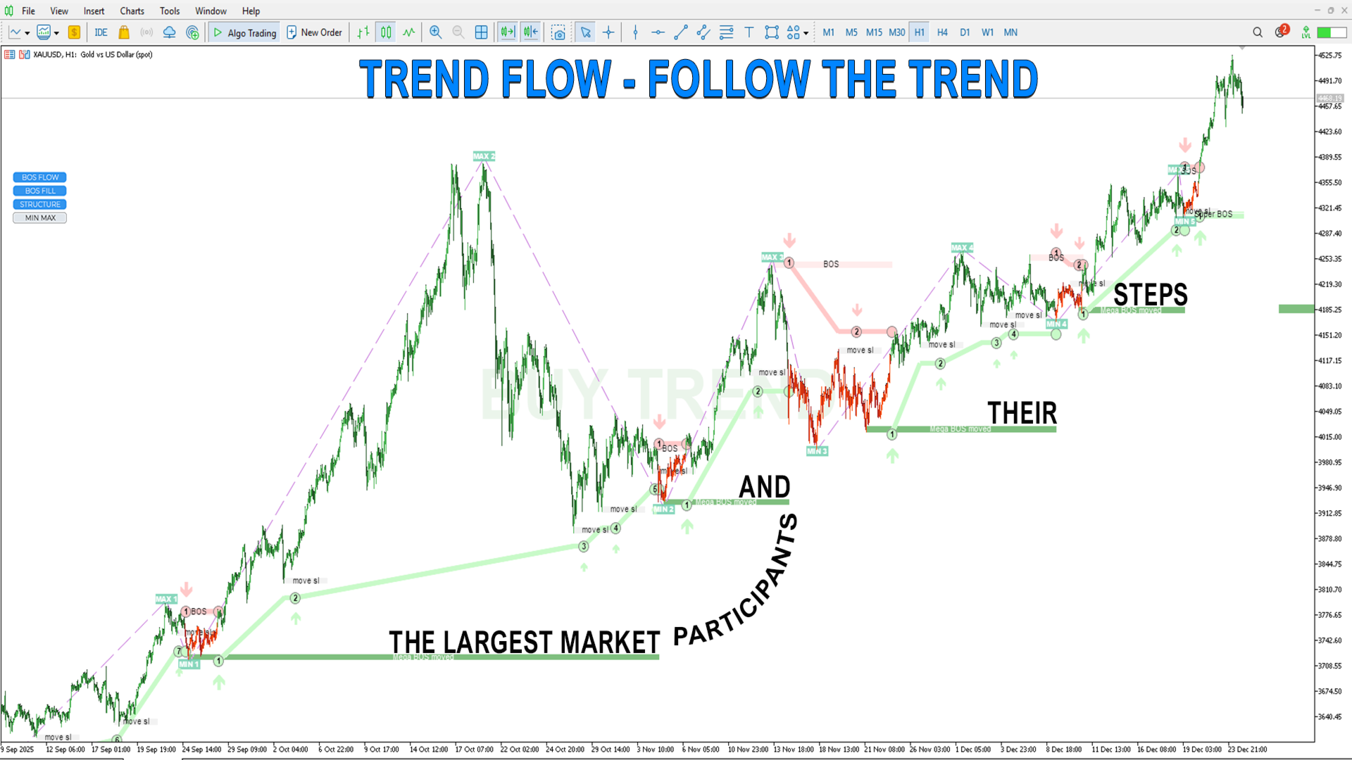 TREND FLOW PRO è un indicatore non repaint che mostra la direzione del mercato. Identifica le inversioni di trend, così come le entrate iniziali e ripetute dei principali partecipanti al mercato. I segnali BOS sul grafico rappresentano veri cambiamenti di trend e livelli chiave dei timeframe superiori. I dati non vengono ridisegnati e rimangono sul grafico dopo la chiusura di ogni candela.