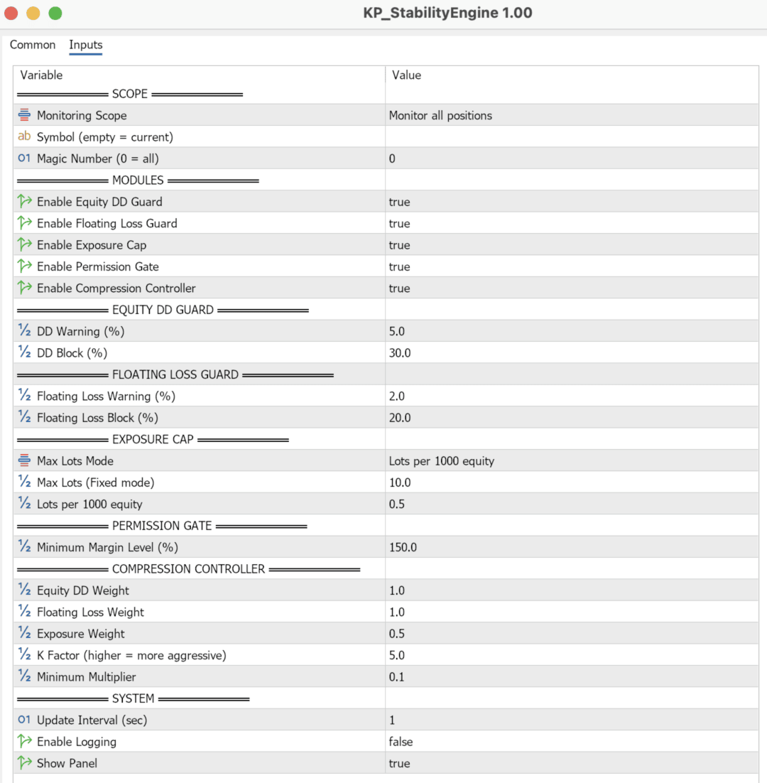 Designed for traders and developers running one or multiple Expert Advisors, KP Stability Engine acts as a central risk governor that continuously monitors your account and dynamically limits exposure, drawdown, and floating losses in real time.