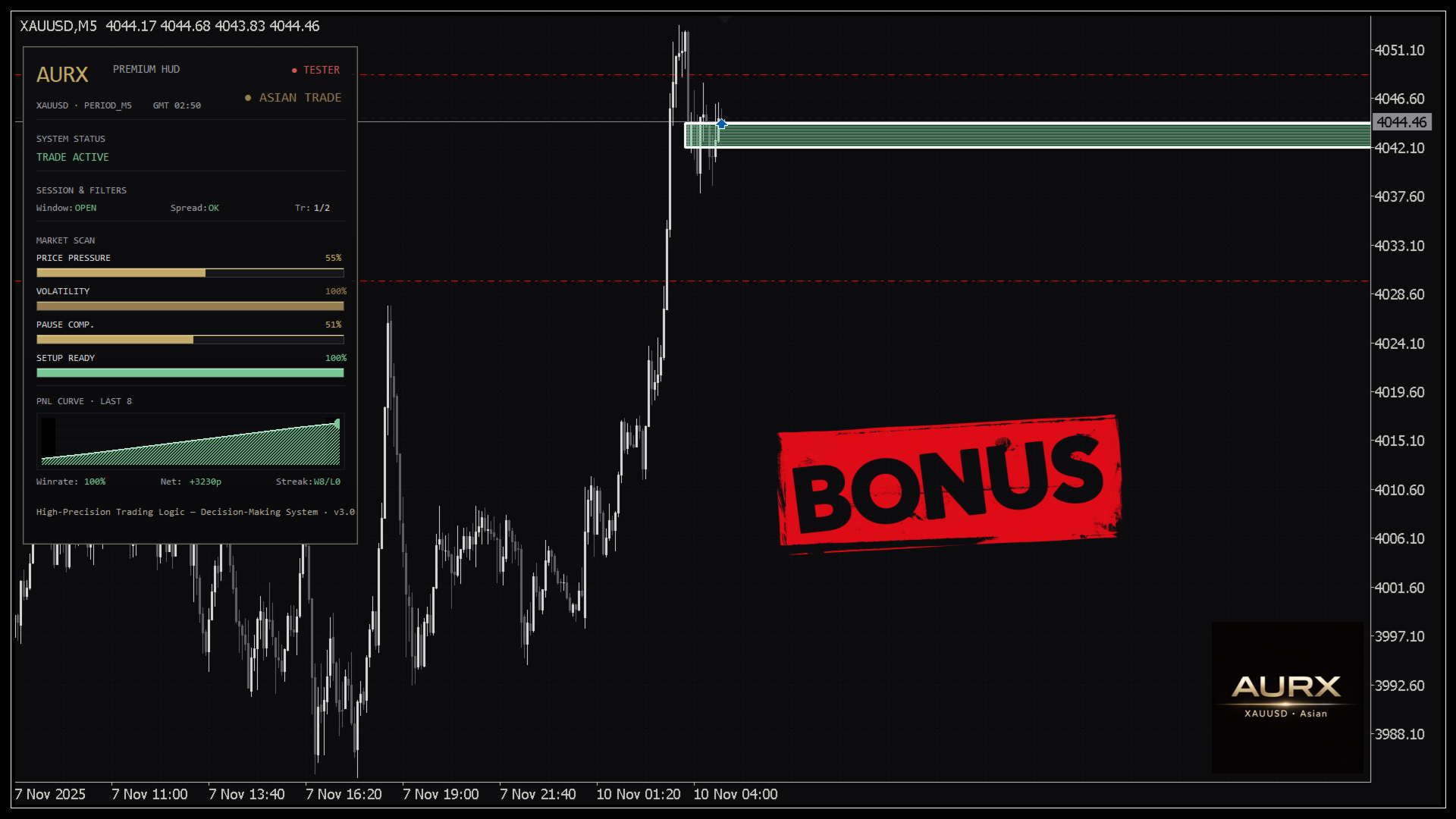 Bonus personale per i proprietari di AURX London — Per i proprietari di AURX London (XAUUSD) è previsto un bonus personale. Nell’ambito del supporto agli utenti, viene fornito l’accesso a una versione separata, AURX Asian, sviluppata per il trading di XAUUSD durante la sessione di trading asiatica.