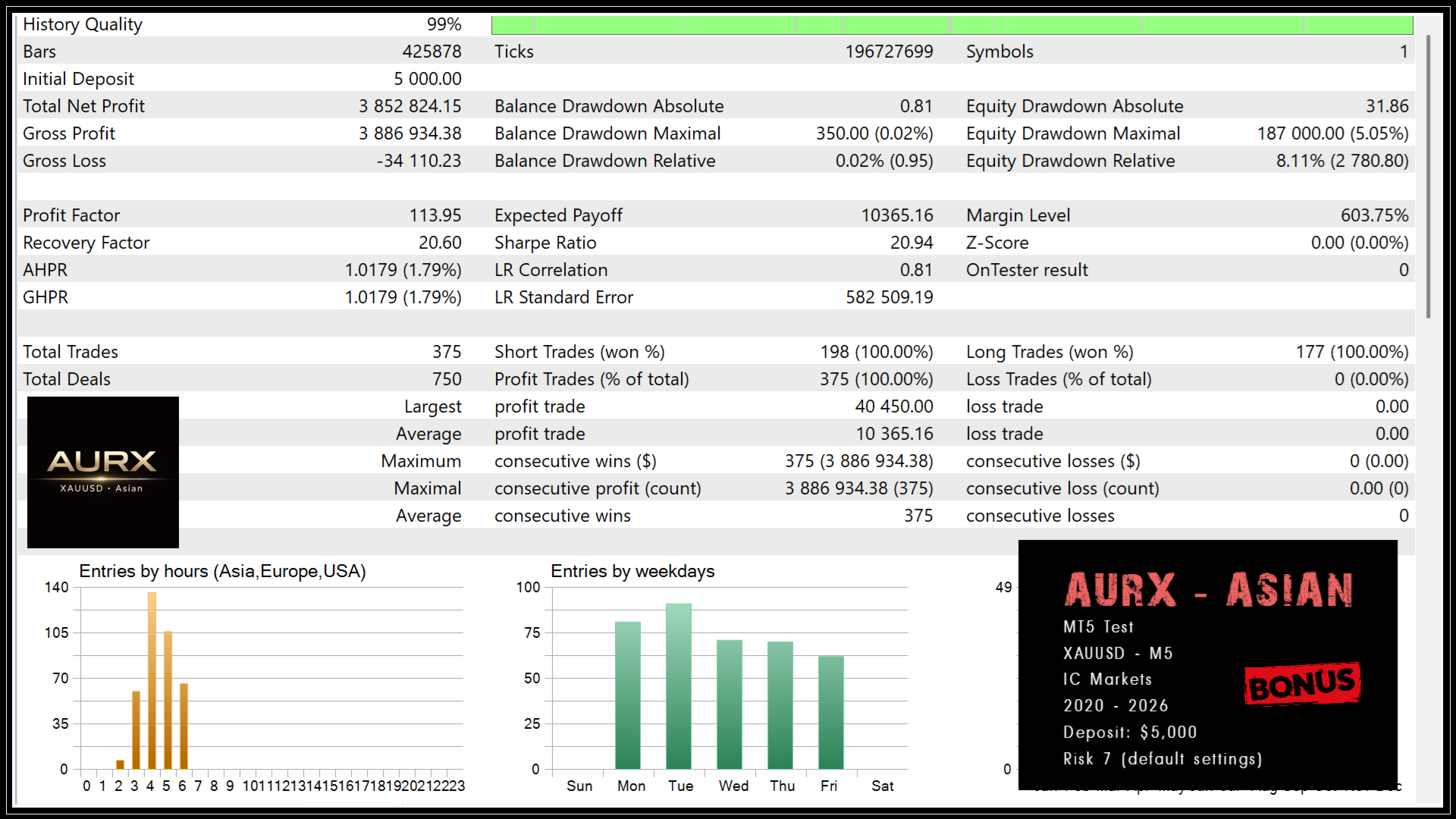 AURX System — un sistema di trading algoritmico professionale di nuova generazione per XAUUSD (M5). Il sistema non ha analoghi diretti nel Market ed è costruito sul controllo rigoroso delle condizioni di mercato, sulla disciplina di trading e su una selezione severa delle fasi di mercato consentite. Non si tratta di un Expert Advisor basato su indicatori, né di una strategia шаблонizzata, né di un adattamento di un approccio di trading popolare, ma di un sistema algoritmico indipendente con una propria logica decisionale. L’algoritmo è orientato all’analisi dello stato attuale del mercato e del movimento attivo del prezzo, lavorando con il comportamento reale del prezzo in tempo reale.