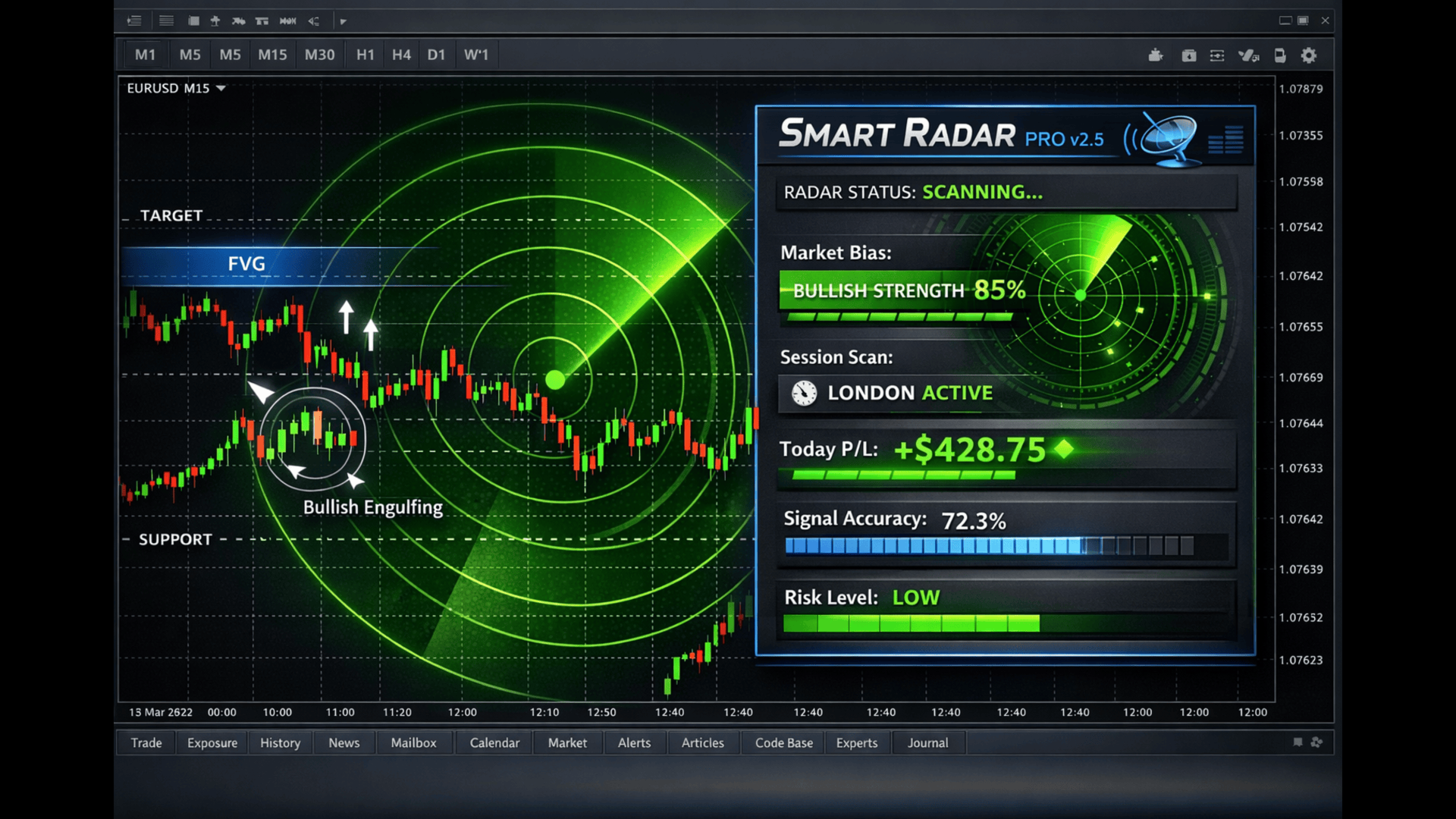 Market Structure Recognition: Smart Radar tracks swing highs and lows to determine market direction and structure breaks, ensuring trades align with the prevailing institutional flow.