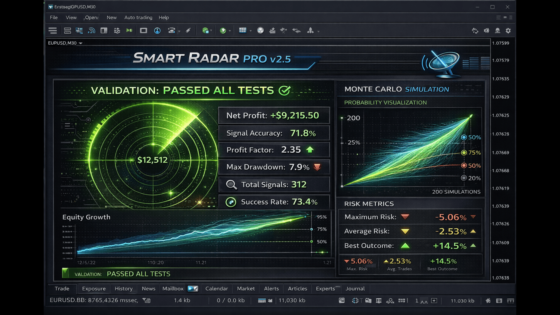 Platform: MetaTrader 5 Account Types: Both netting and hedging accounts supported (Alpha Killzone optimized for netting) Minimum Deposit: $100 recommended for Smart Radar, $500 recommended for Alpha Killzone Recommended Symbols: EURUSD, GBPUSD, XAUUSD, NAS100, US30 Timeframe: M15 primary (Alpha Killzone uses H4, H1, M15 confluence)