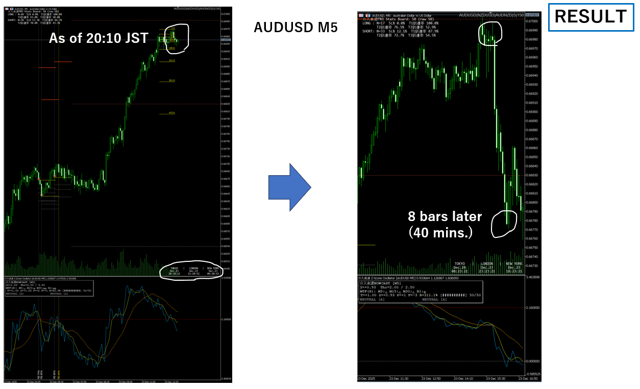 At 20:10 JST, the Scanner flagged AUDUSD M5 and the Overall Score was “B” (good, but not “A”).