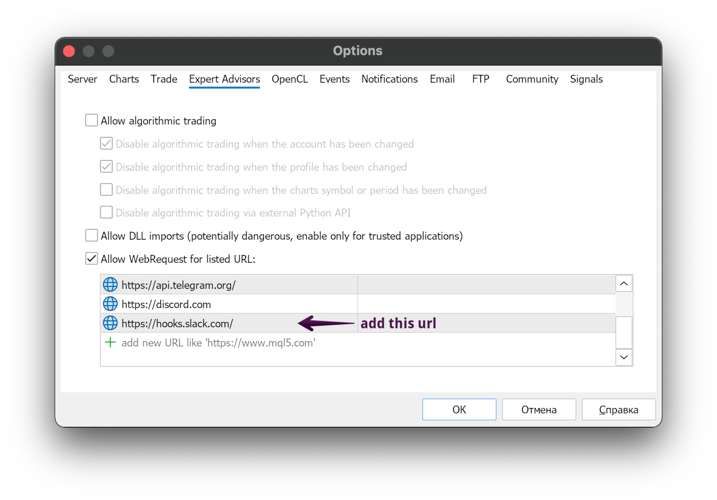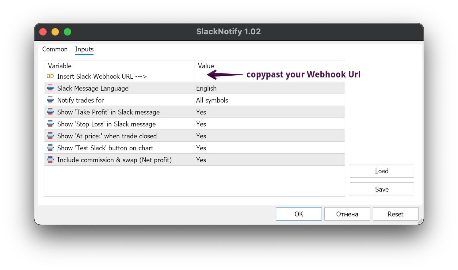 - In MetaTrader 5 abilita WebRequest per https://hooks.slack.com/ , aggiungi l’utilità a un grafico qualsiasi e inserisci il Webhook URL nei parametri di input.