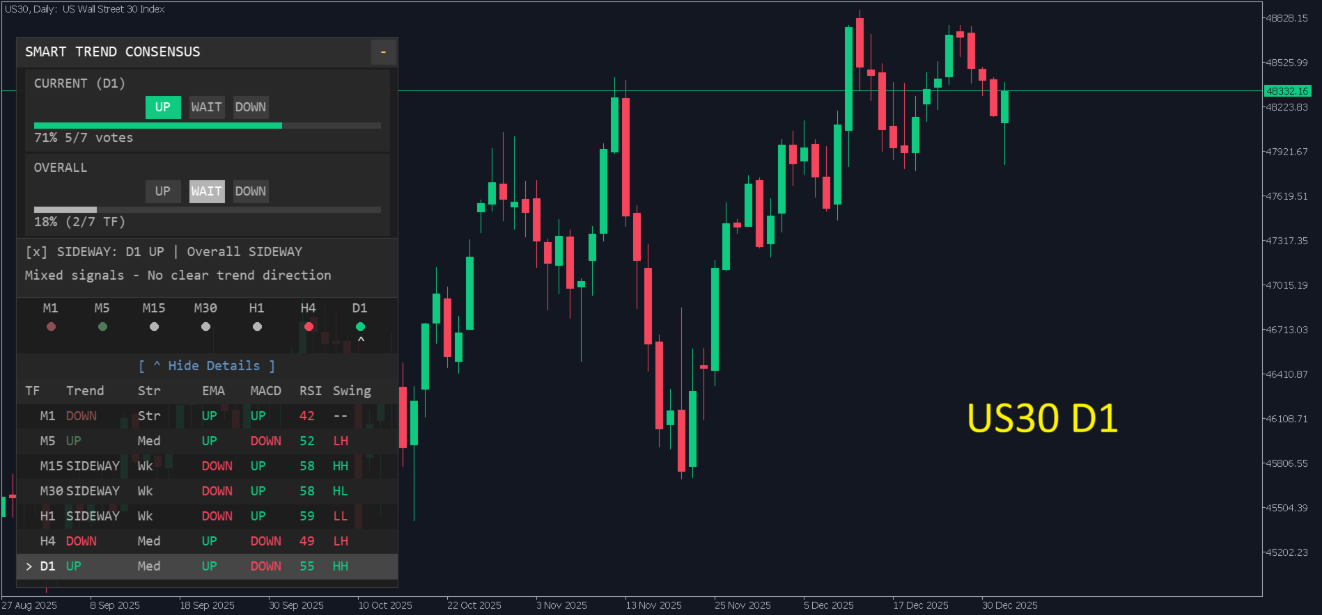 Smart Trend Consensus MT5 è uno strumento di analisi tecnica che consolida i dati da 7 timeframe simultaneamente (M1, M5, M15, M30, H1, H4, D1). L'indicatore utilizza 7 criteri tecnici per valutare lo stato del trend su ogni timeframe e visualizza tutte le informazioni su una dashboard visiva.