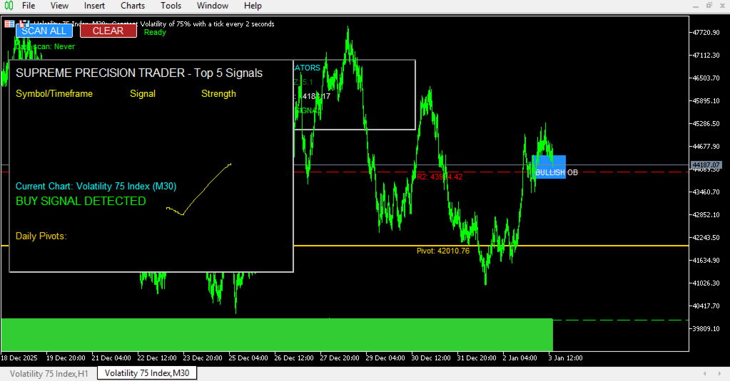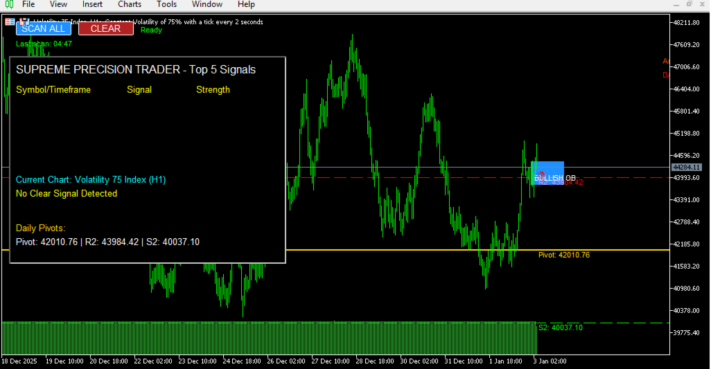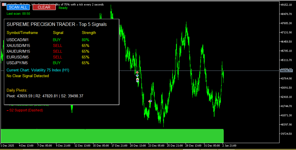 The Supreme Precision Trader Scanner does all the heavy lifting for you — scanning every symbol in your Market Watch across 5 timeframes (M5, M15, M30, H1, H4) — and delivers the top 5 strongest signals directly to your chart.