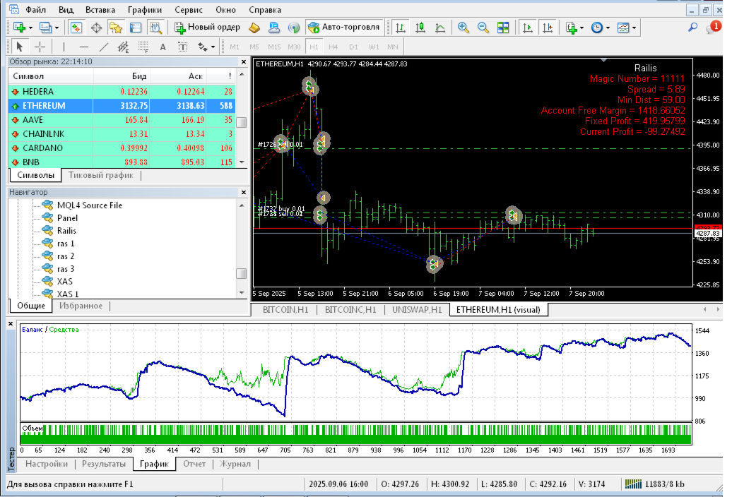 Убыточный ордер ставит противоположный запоминая убыок и открывает стопы при достижении прибыльности - Profit=1;. Каждый ордер запомипает свой баланс на определенном уровне - Min Dist=200;