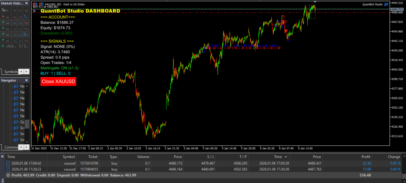 Quant_Bot Studio can trade multiple instruments simultaneously, including currency pairs, commodities, and indices, using the same institutional logic. Multi-timeframe confirmation adapts signal quality to both low-volatility consolidations and high-momentum breakout conditions.