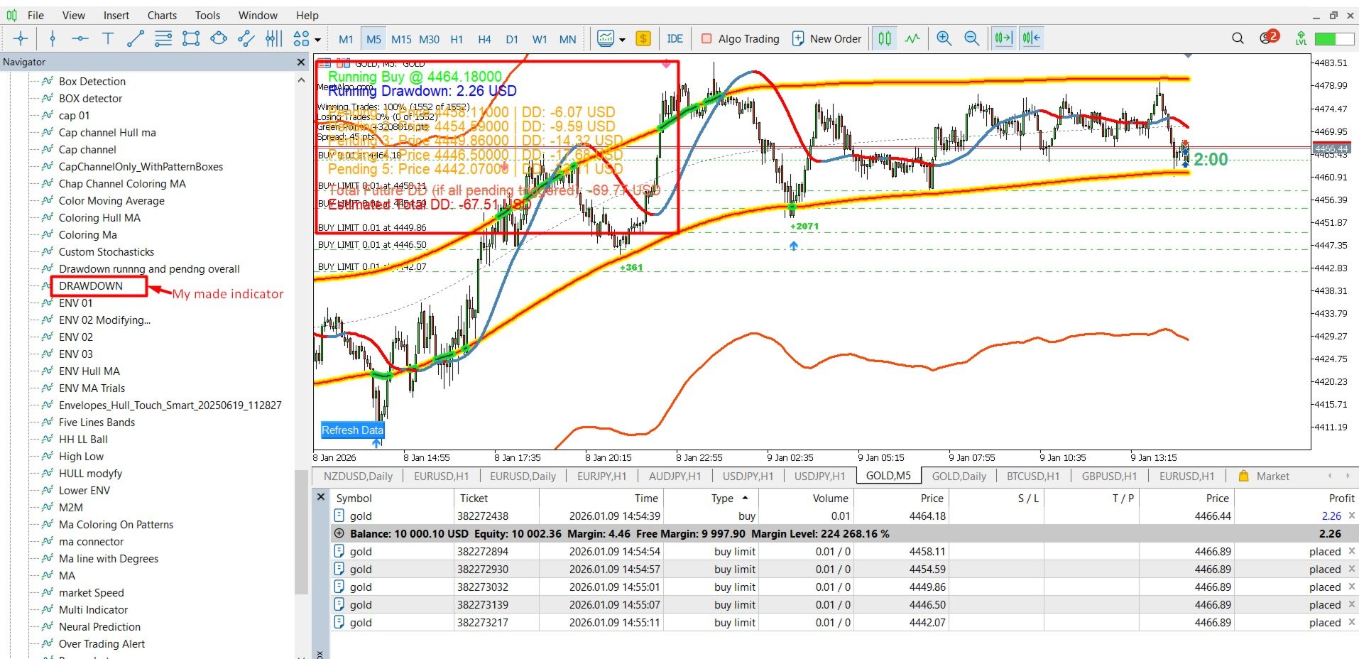 This indicator allows you to see the future drawdown in advance — not only for currently running trades, but also for all pending orders combined, assuming they get triggered step by step.