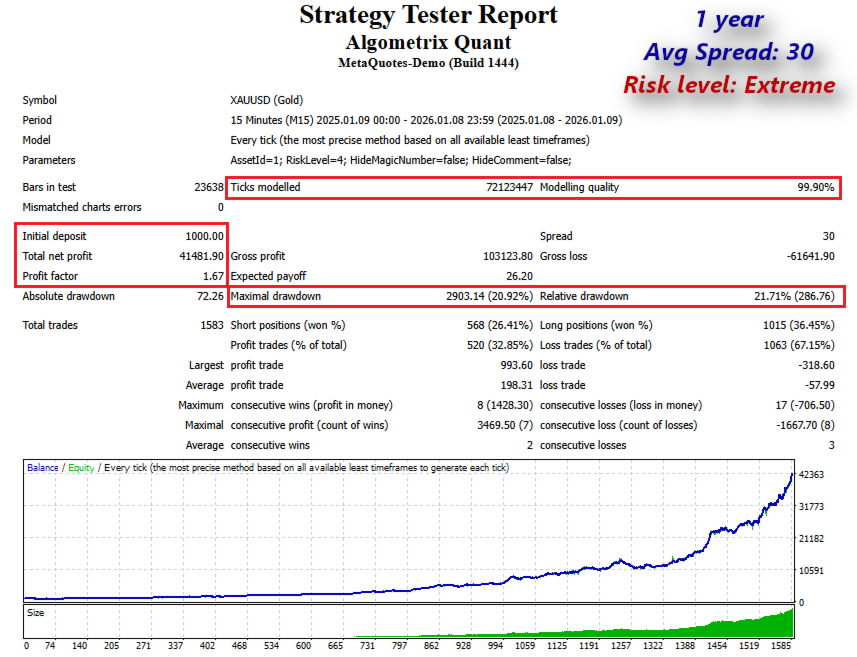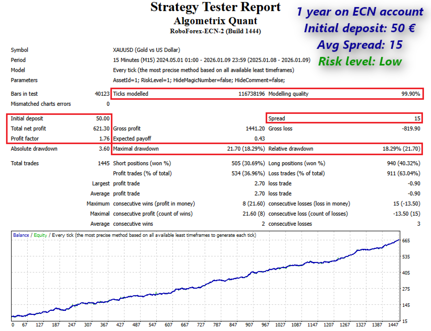 Algometrix Quant è sviluppato all'insegna della trasparenza. Utilizzando un RRR fisso di 1:3, il sistema non dipende da una percentuale di vincita (win rate) estremamente elevata per mantenere la sua traiettoria. Si concentra invece sulla crescita del capitale attraverso la probabilità statistica e l'esecuzione disciplinata dei trade. L'EA è compatibile al 100% con il MetaTrader Strategy Tester, consentendo verifiche rigorose su diversi cicli di mercato utilizzando dati tick di alta qualità.