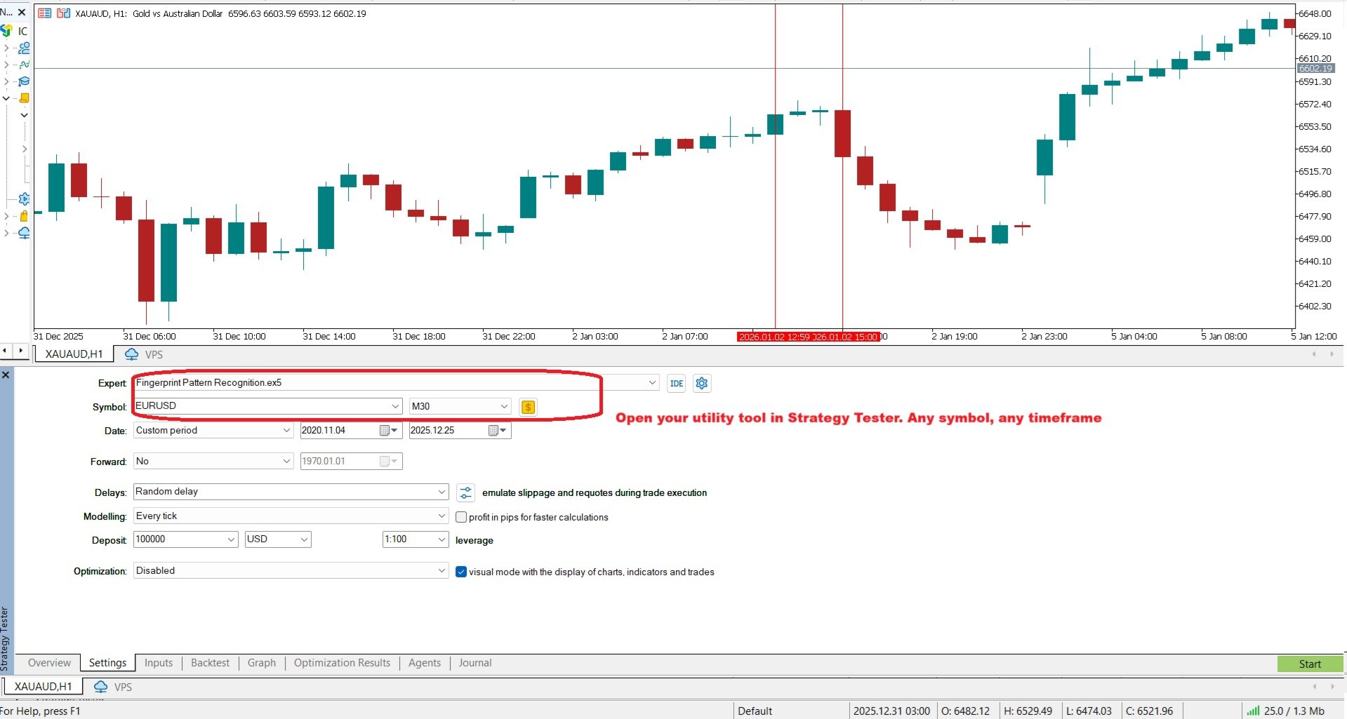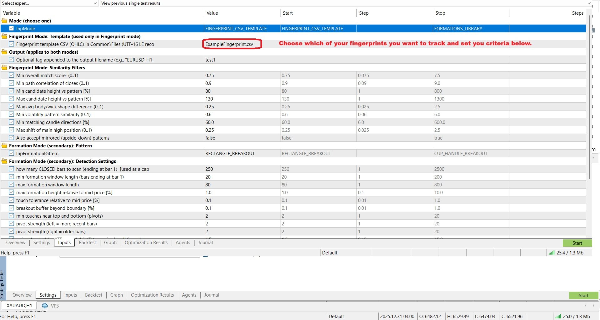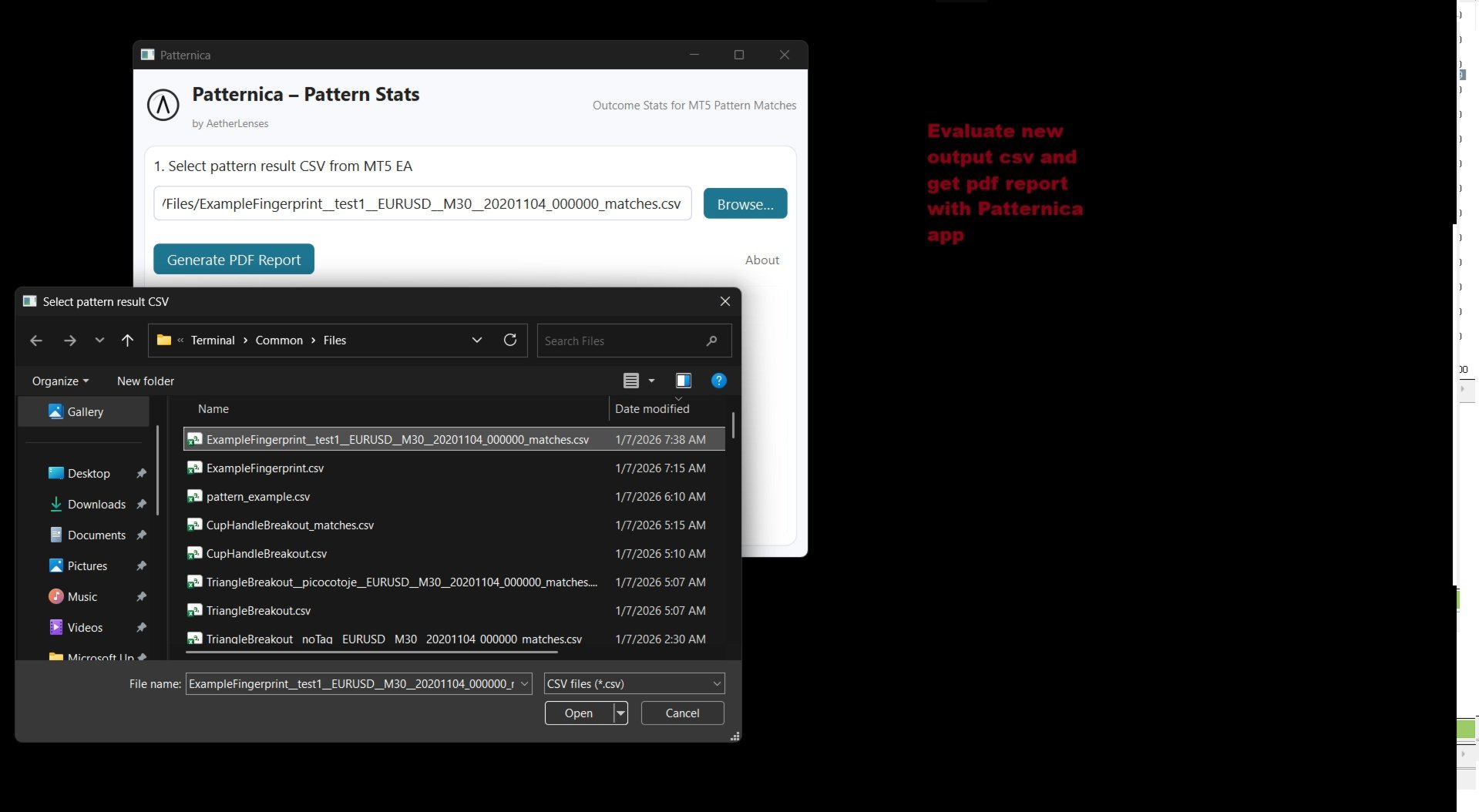 4. Let it run in Strategy Tester. Every match is written to a results CSV (Common Files).