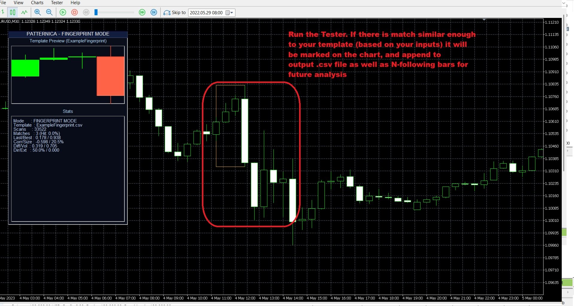 Compares recent closed candles against a user‑provided template CSV (OHLC). When a match is found, the EA marks it on the chart and writes a row to a results CSV, including forward bars after the match (for outcome analysis).