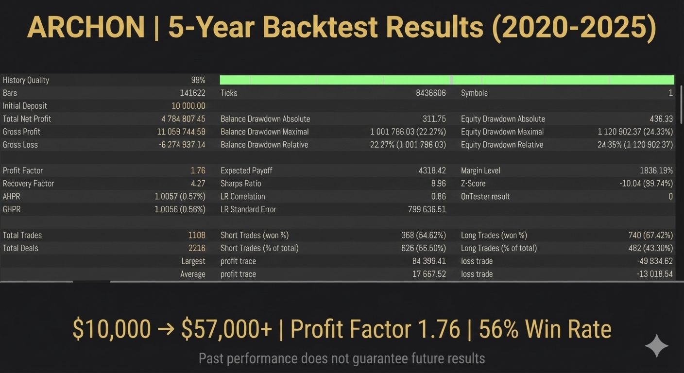 Archon has been rigorously tested across 5 years of historical data (2020-2025), demonstrating consistent profitability through various market conditions - trending markets, ranging periods, and high-volatility events. The system maintains a healthy profit factor while keeping drawdowns within acceptable limits for both retail traders and prop firm challenges.