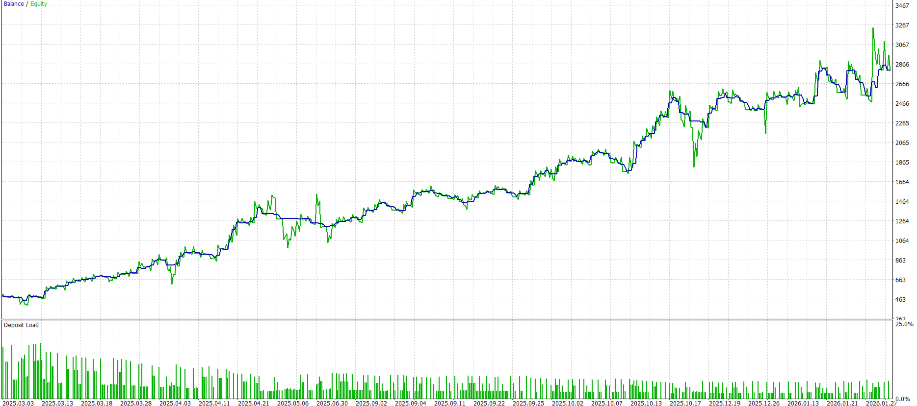 • Stop loss placed at: Entry Price - (3 × Step × ATR), capped by MaxStopLossPips