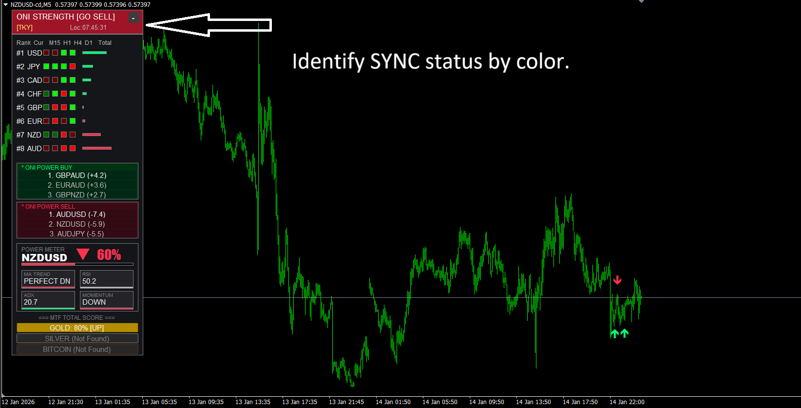 Current: Clear text instructions like "ONI STRENGTH [GO BUY]." Professional color coding: Midnight Gray (Wait), Emerald Green (Buy), and Crimson Red (Sell). Even when the panel is minimized, you can monitor opportunities via the header color and text.