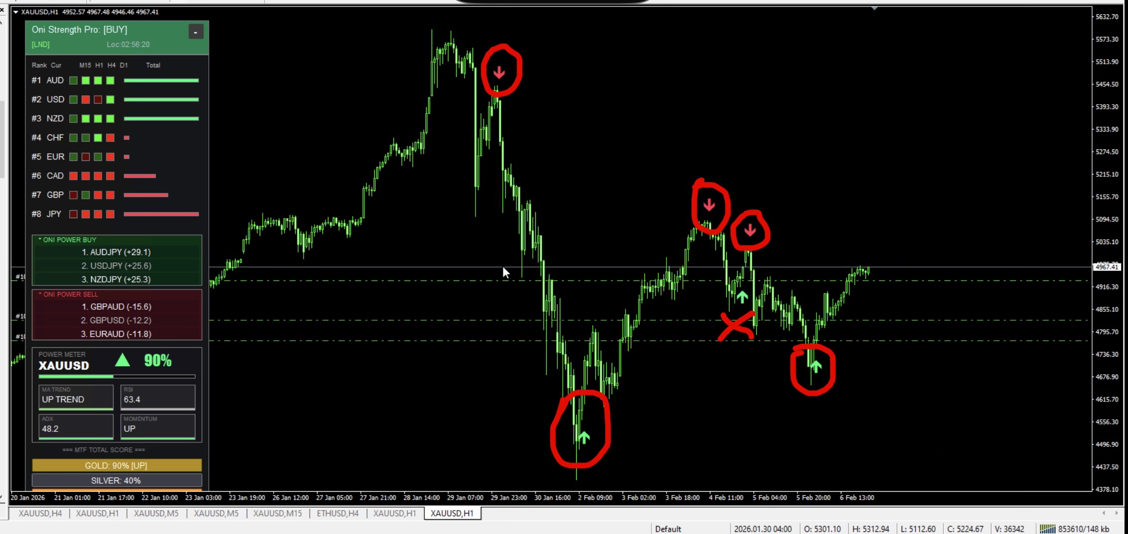 For GOLD or BTC, the Currency Matrix (Strength Diff) is not calculated, but detection via "Power Meter" and "Arrow Signals" remains fully effective.
