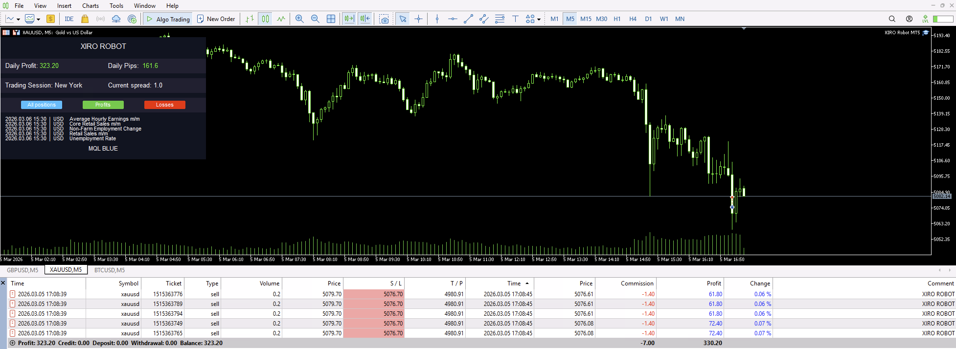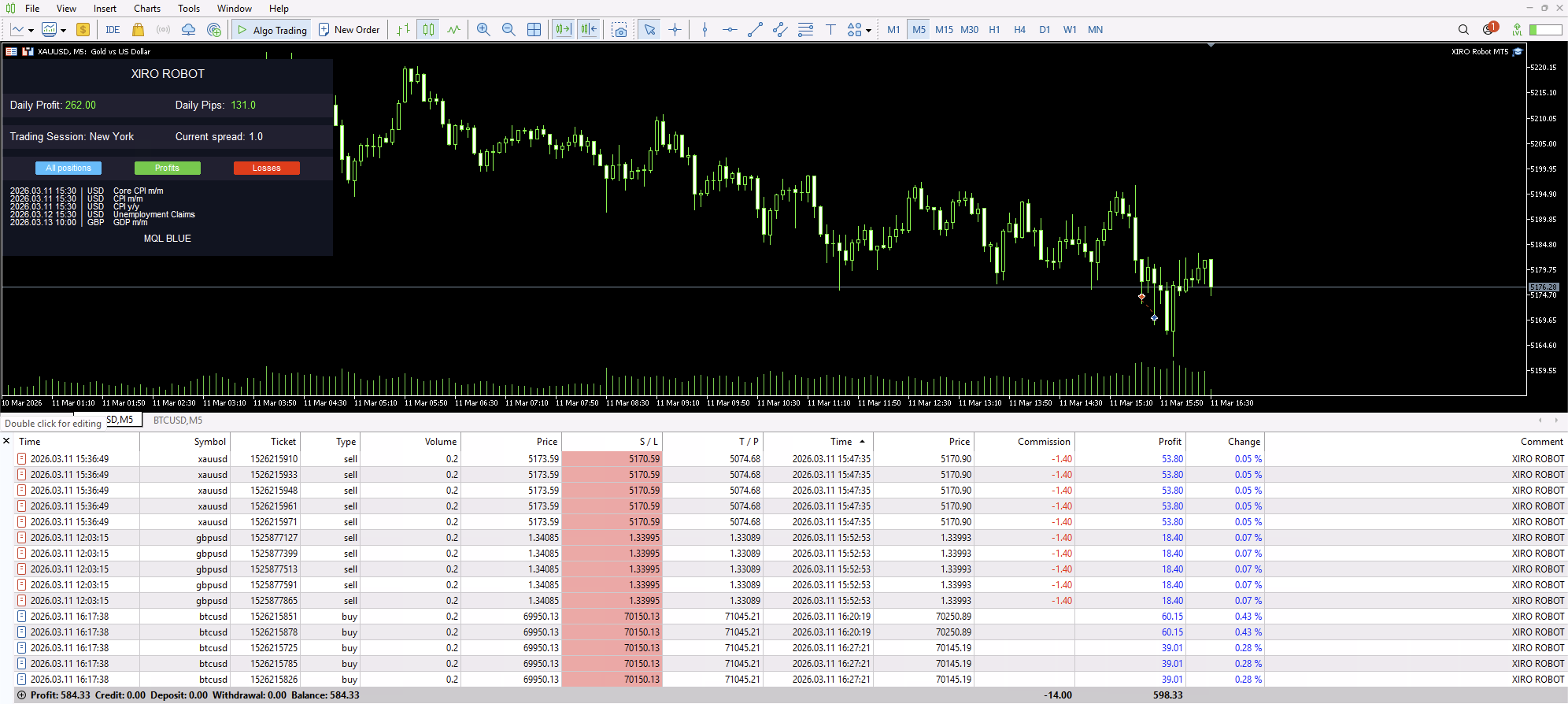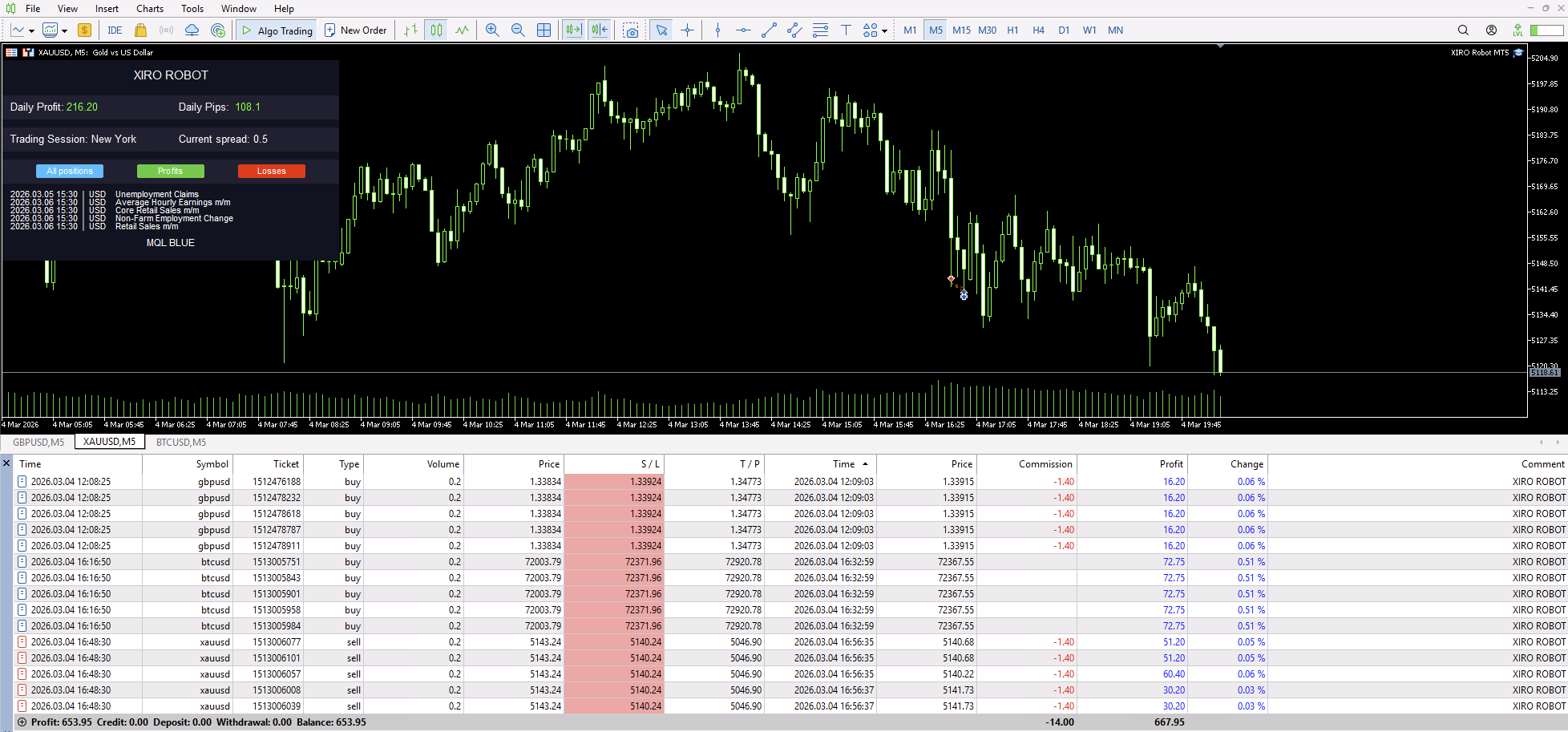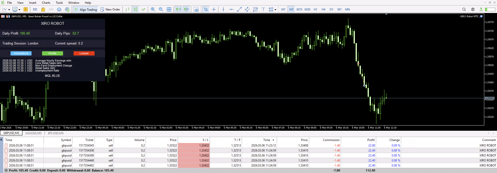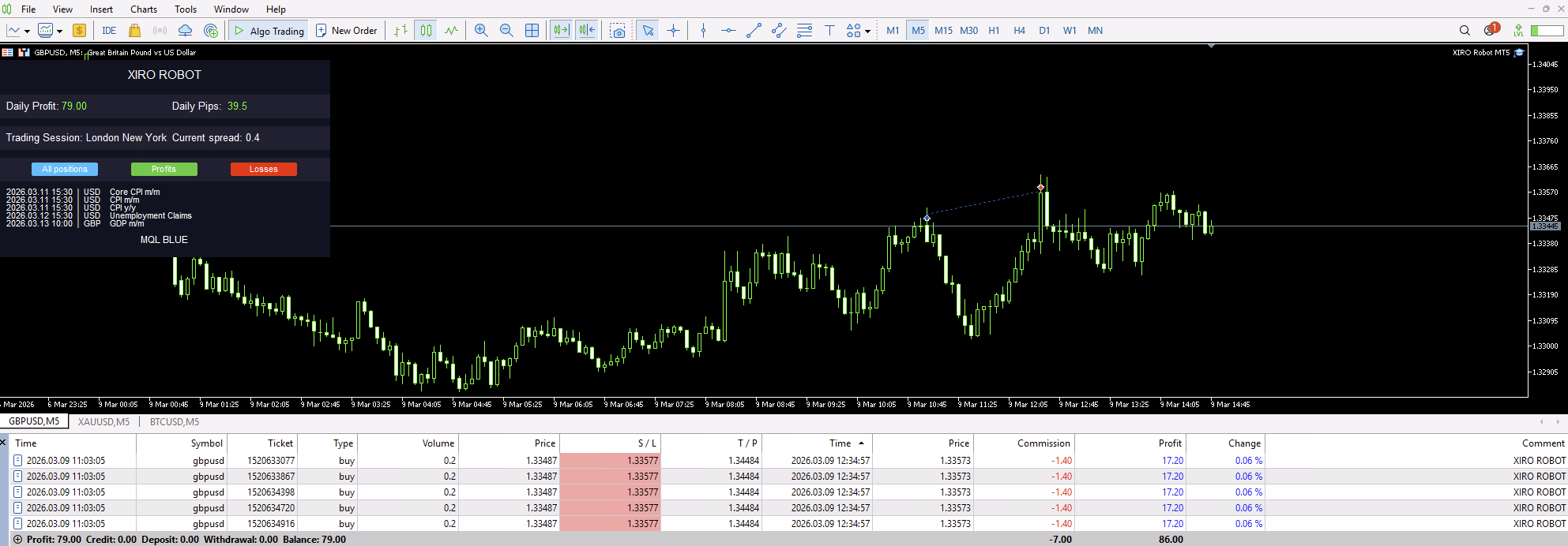XIRO Robot is designed to work on GBPUSD, XAUUSD and BTCUSD combining advanced market analysis with adaptive trade management and controlled risk logic. The system focuses on precise entries, dynamic position handling and long term stability rather than random trading activity.