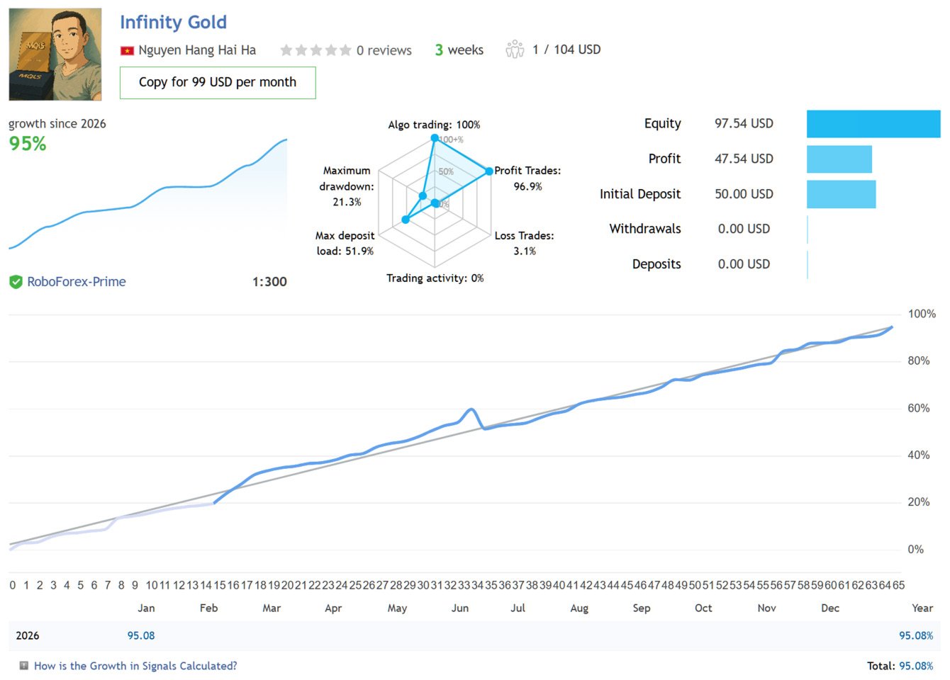 EA Infinity Gold features a clean and user-friendly configuration. Traders can begin with the default settings (optimized for 2-digit Gold pricing) and a recommended starting balance of $300, making it accessible while still robust enough for real market conditions.