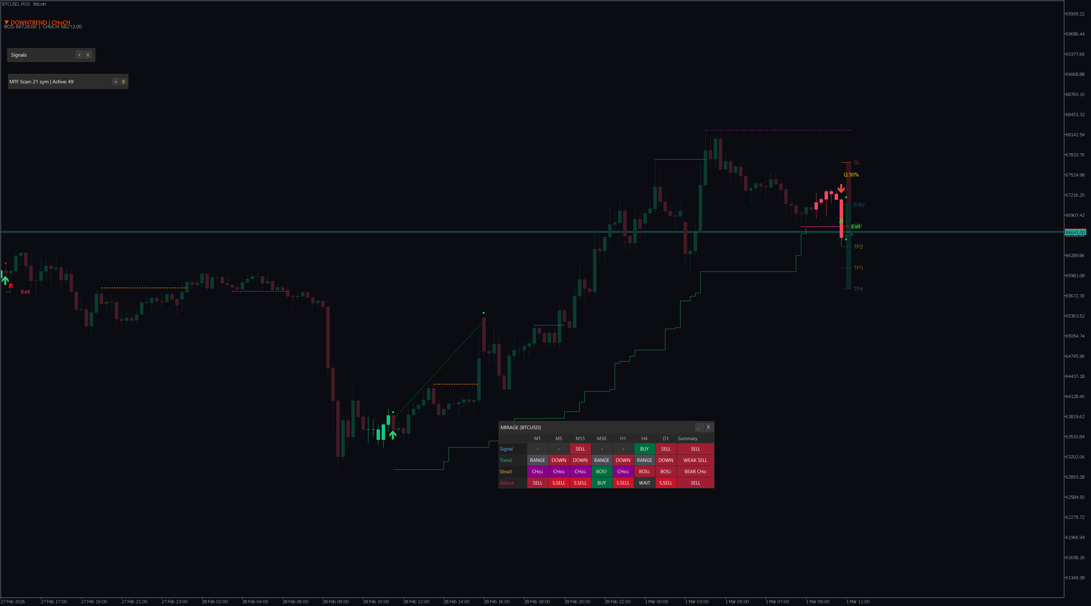The Mirage Trading System has just triggered a SELL signal on the M15 timeframe for BTCUSD.