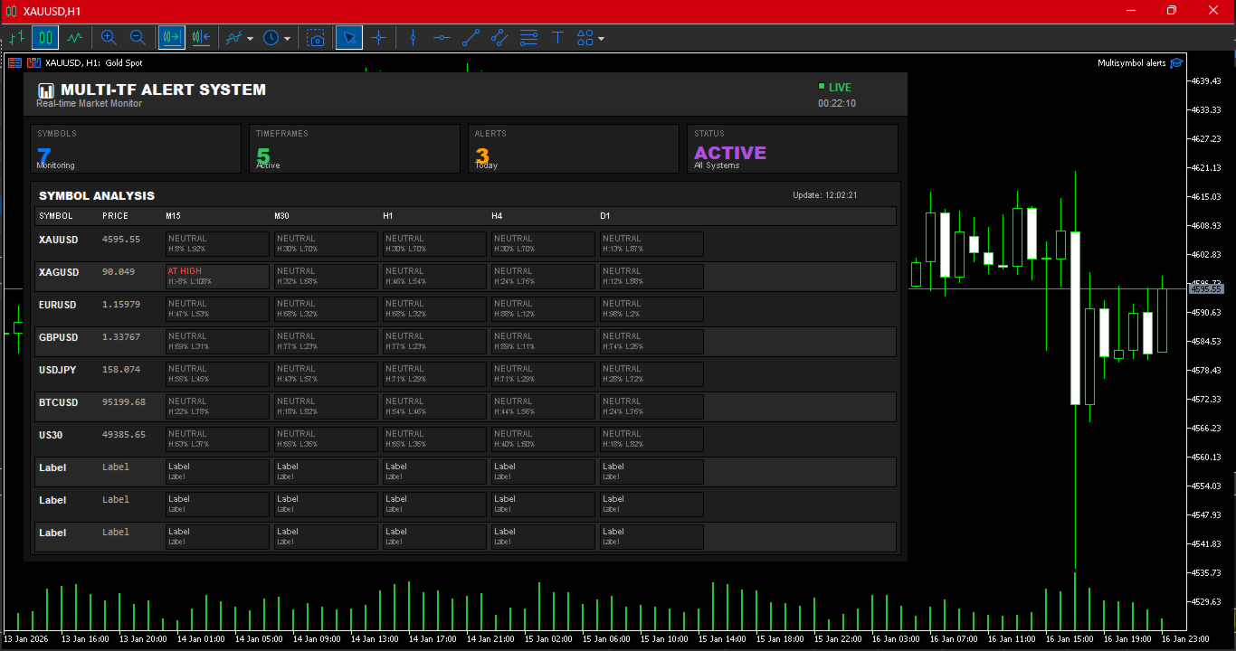 Il Multi-TF Alert System è uno strumento di monitoraggio completo progettato per i trader che necessitano di tracciare molteplici mercati su diversi timeframe senza cambiare costantemente tra i grafici. Che tu faccia trading su forex, oro, indici o criptovalute, questa dashboard fornisce una visione chiara e organizzata di dove si trova il prezzo rispetto ai massimi e minimi recenti.