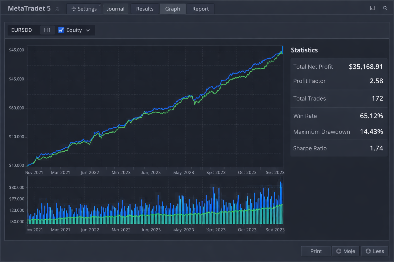 The EA performs best in trending market conditions where directional moves persist long enough for trailing stops to lock in meaningful profits. Performance typically suffers during prolonged ranging or highly volatile whipsaw conditions, though the time session filters and higher timeframe confirmation help mitigate exposure to these unfavorable periods. Different strategy configurations may exhibit uncorrelated performance, providing portfolio-level diversification when multiple strategies are deployed simultaneously.