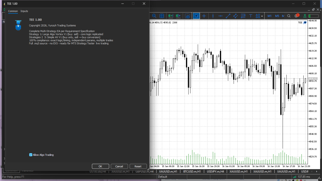 The Trend Execution Engine is a comprehensive algorithmic trading system engineered for MetaTrader 5 that represents the culmination of advanced technical analysis, robust risk management principles, and sophisticated software architecture. This Expert Advisor is not a simple indicator-based system but rather a fully-integrated trading platform that combines multiple independent strategy modules operating simultaneously across different timeframes, instruments, and market conditions to provide diversified exposure and optimized risk distribution.