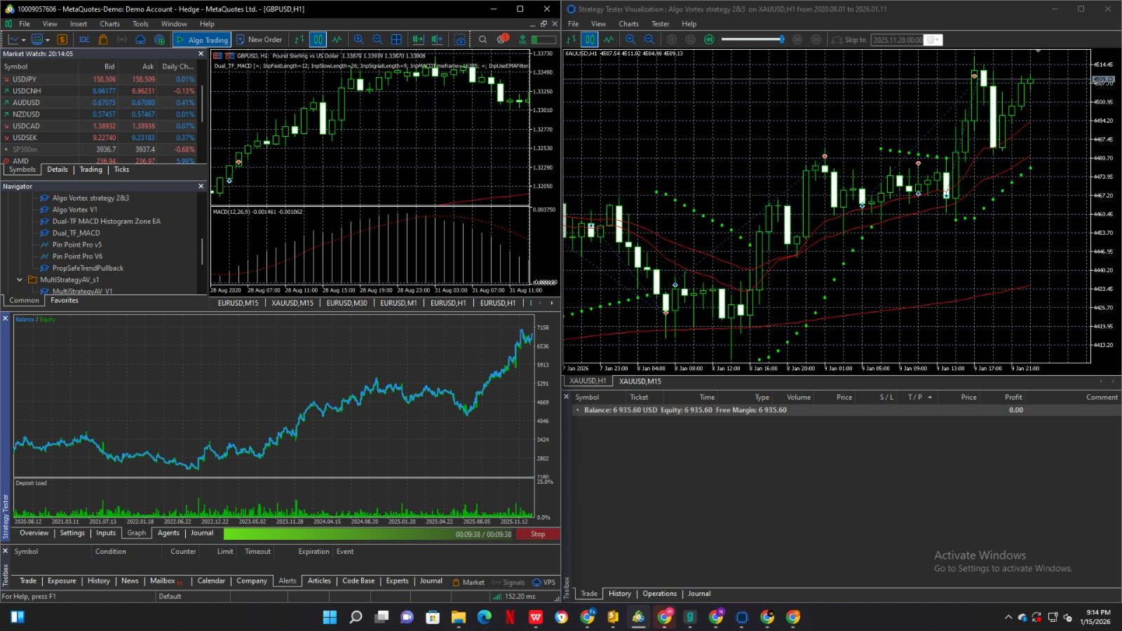 The EA is fully compatible with MetaTrader 5's Strategy Tester, supporting both single-pass backtests and multi-parameter optimization runs. The modular architecture allows each strategy to be tested independently by disabling others, facilitating isolated performance analysis. Historical tick data can be used for maximum accuracy, or faster one-minute OHLC testing can be employed for preliminary parameter exploration.